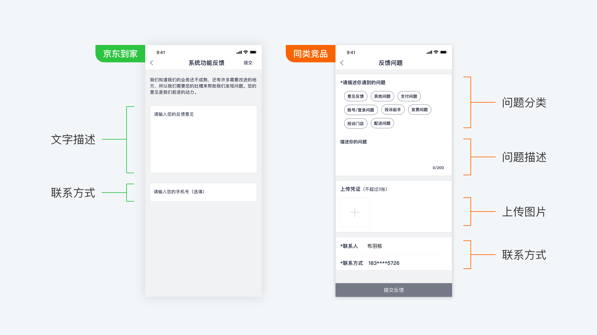 对比上图的两个界面不难发现,右边的设计在对用户心理的把控上做的更为细致,通过将问题的分类列出、提供上传图片等功能,让用户在反馈过程中也能保持良好的体验,减少了对信息的焦虑感。