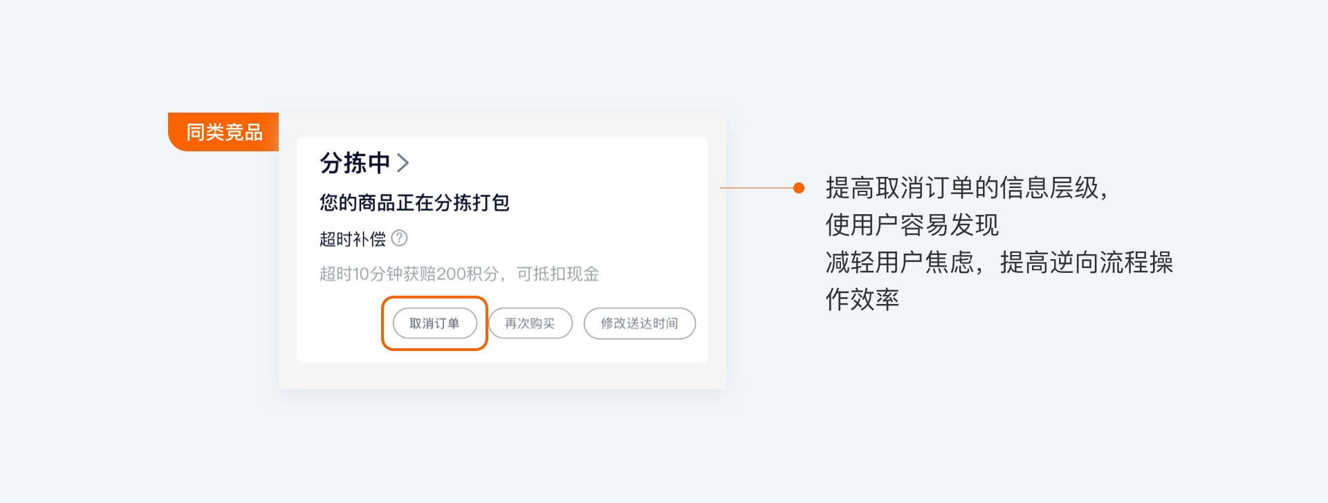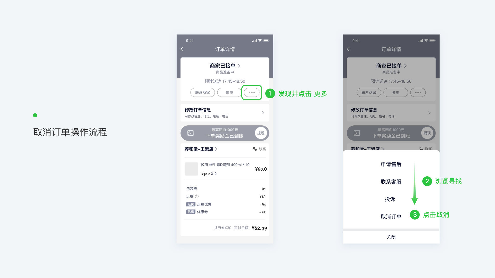 由以上可以看出,取消订单入口隐藏略深,进入详情页后,从发现更多到点击取消需要3步。