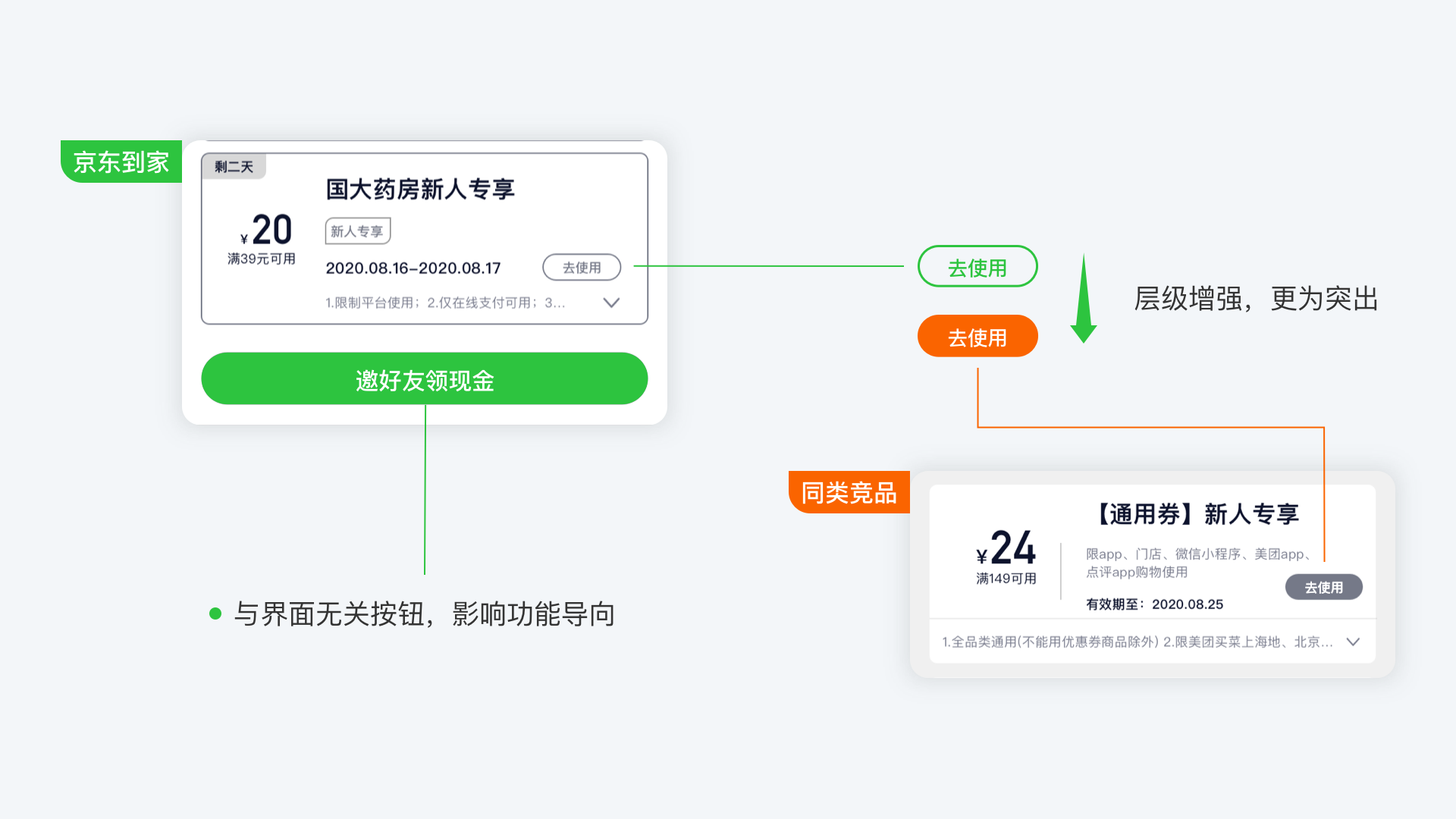 而在京东到家的优惠券界面中(如下图左边界面所示),却把“去使用”按钮使用线框进行了弱化处理,并且在界面底部使用了一个实色按钮去引导用户进入“邀友领现金”的活动页,使得用户的视觉中心发生转移,从而影响了原本界面的功能导向。
