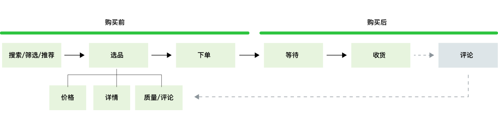 由下图可以看出,用户在购买前查看评论是重要因素之一,而收到商品在没有质量问题前提时,购物行为已可结束。