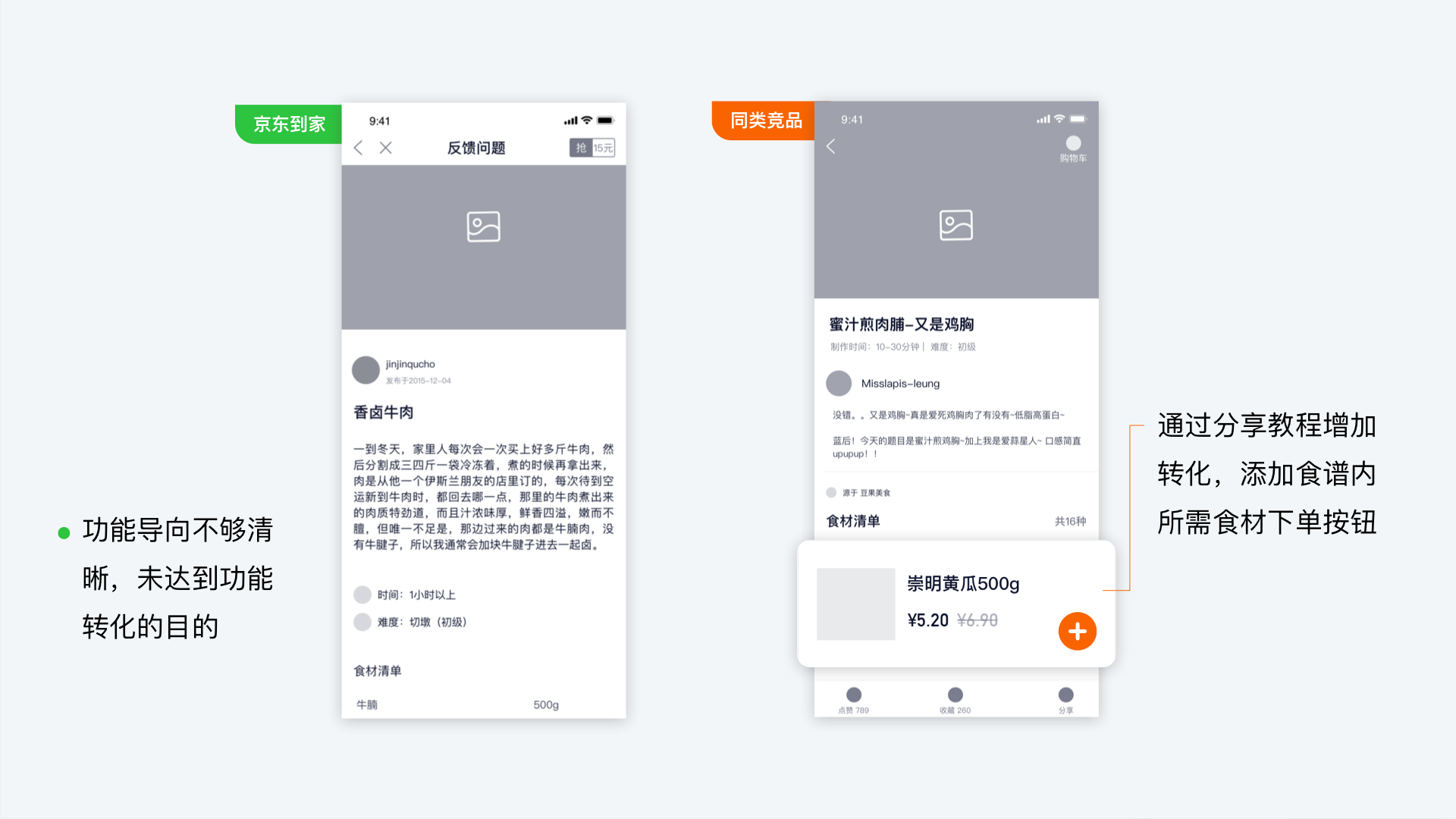 作为一个生鲜电商产品,产品在设计菜谱这样一个功能的时候必然不是单单的想告诉用户这道菜如何做,需要哪些食材。而它最终的目的是通过分享菜谱的形式来吸引用户,引起用户的好奇心,促使用户下单,完成转化。