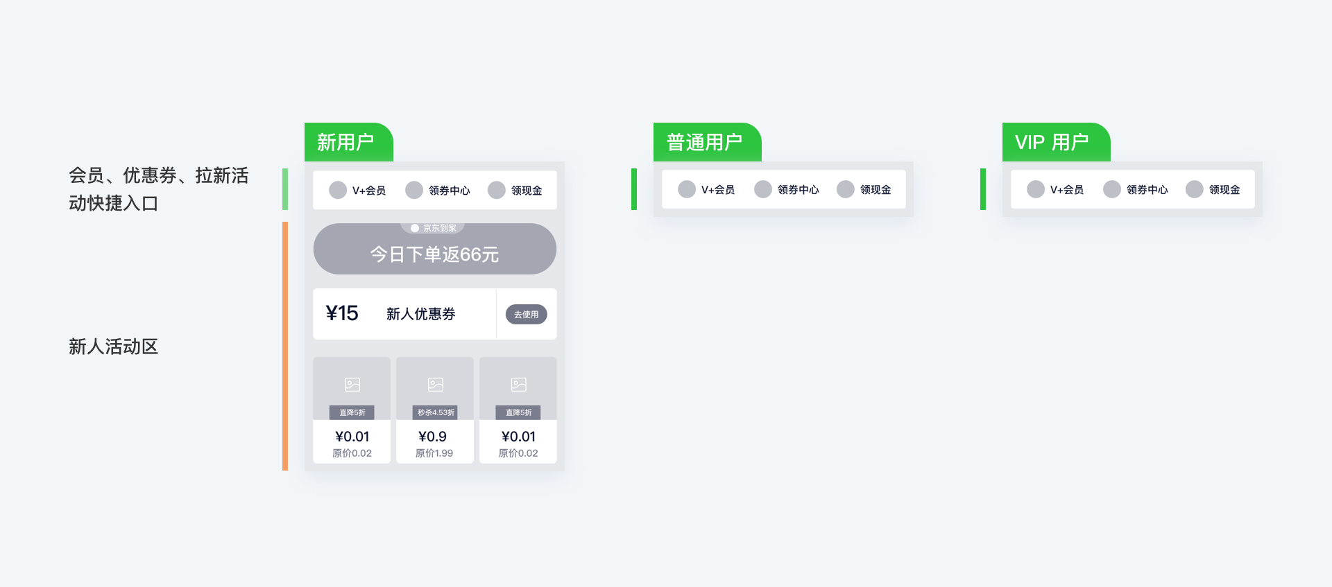 由以上可以看出3种用户角色之间,在呈现上新人活动专区不同,而快捷入口完全相同。