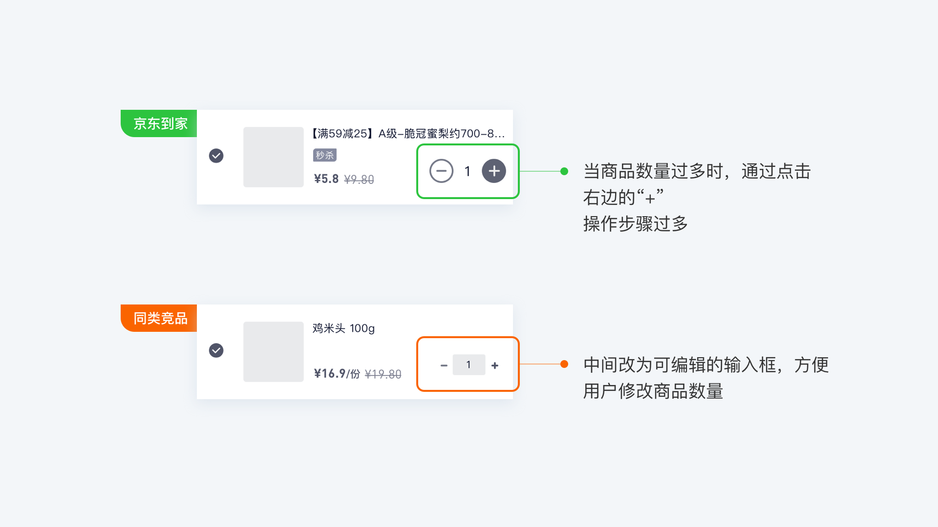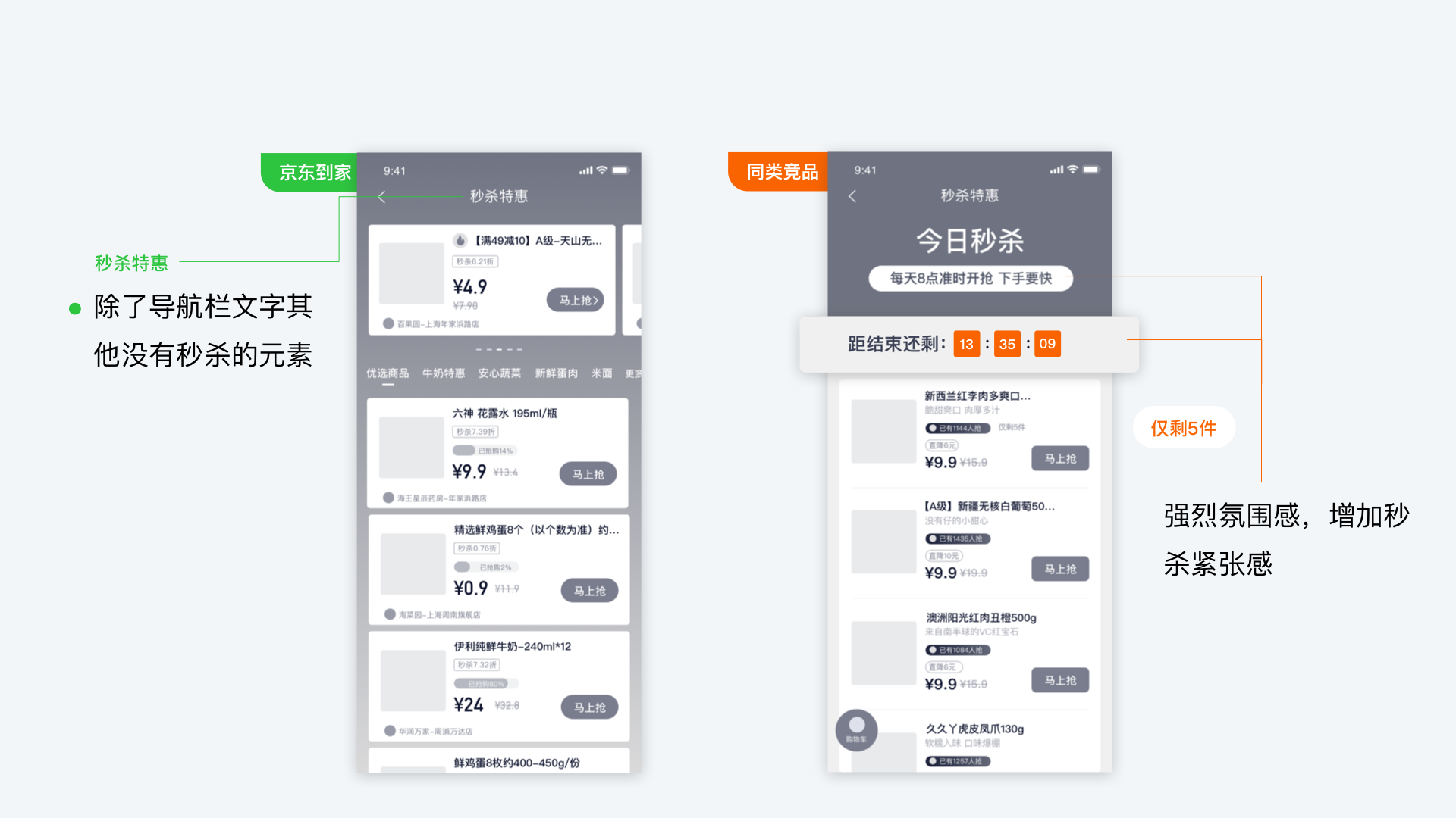 上图中京东到家的秒杀页面虽然展示出了低价,但由于核心倒计时功能的缺失,并未给用户营造出一种时间上的紧迫感,以至于无法驱动用户产生立即购买的情绪。