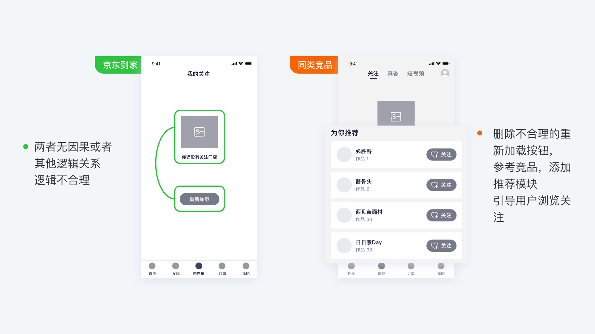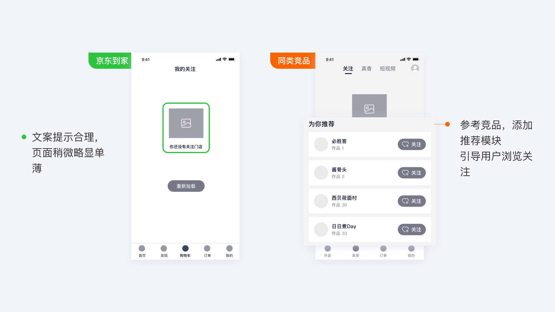 抛去之前提过的【重新加载按钮】不合理,“你还没有关注门店”的提示在用户角度也是合理的,但是站在产品角度还是可以优化,可加入门店推荐,提高转化率。