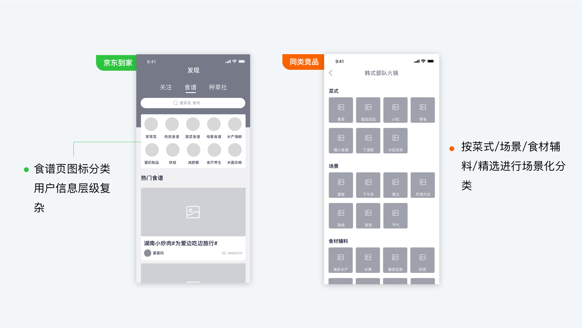 内容分类就是化繁为简,从而更好的满足用户需求。根据用户场景来对功能进行分类,由菜式、场景、食材进行分类使用户能快速找到所需入口,如下