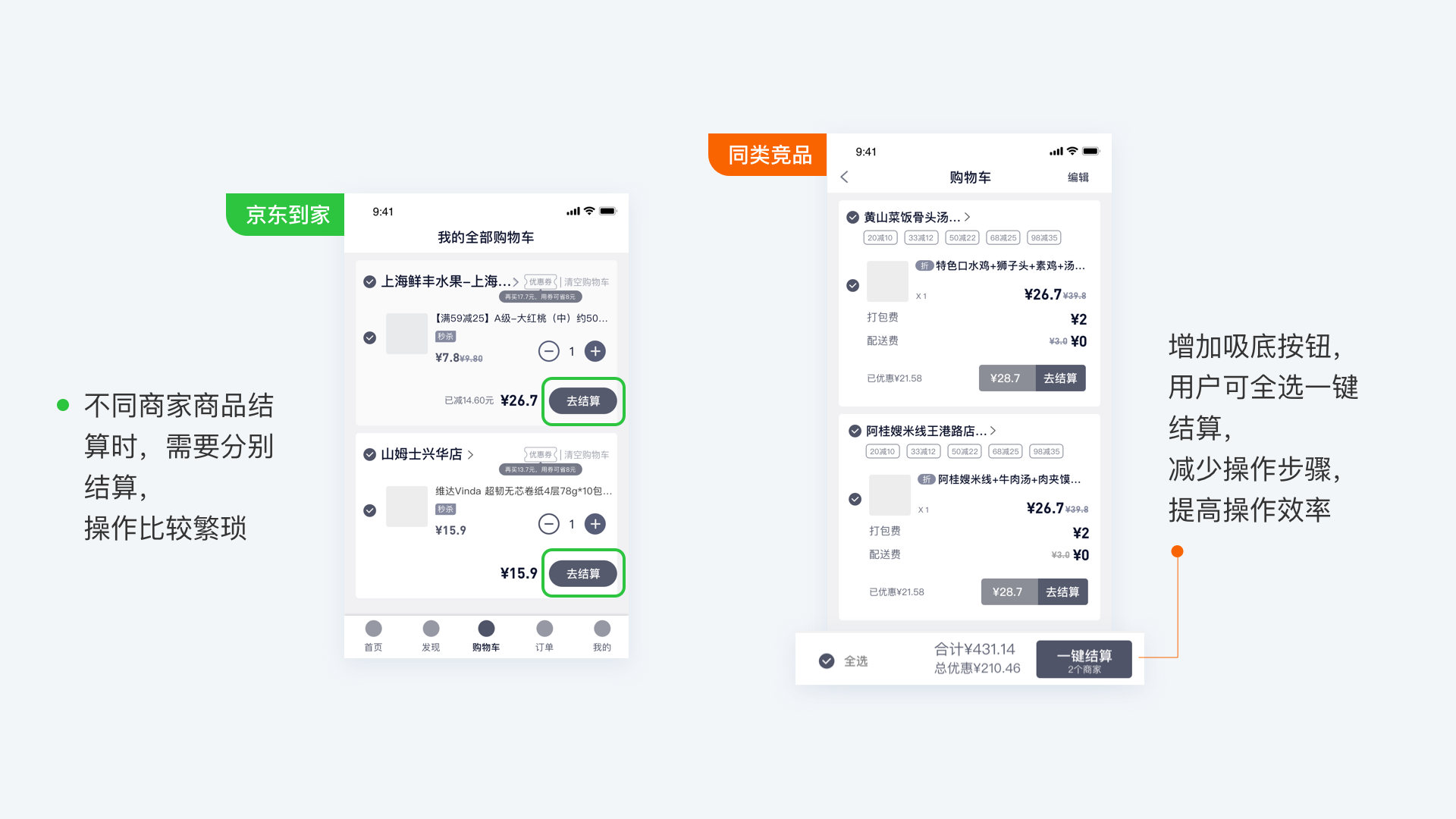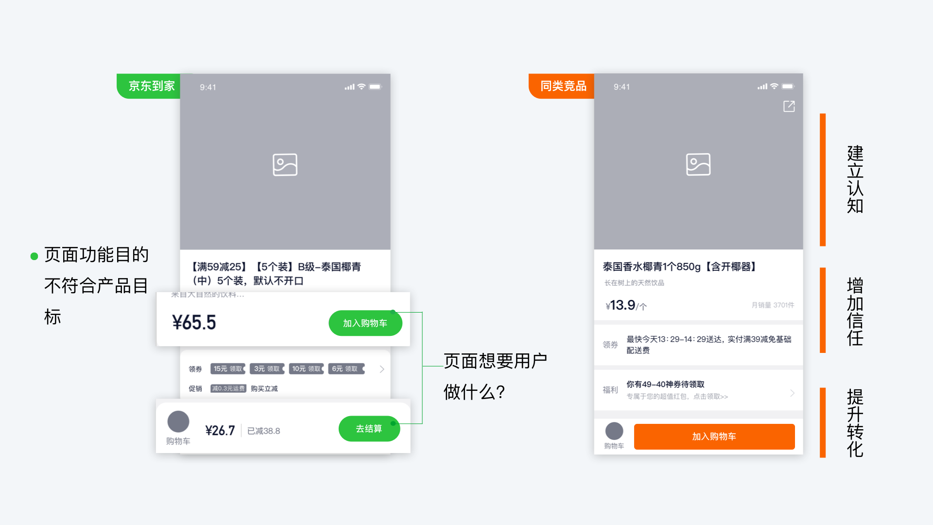 详情页面中需要引导用户把商品加入购物车,结算功能主要在购物车中体现。通过滑动商品详情页,加入购物车按钮消失,吸底按钮去结算,功能导向发生偏差。