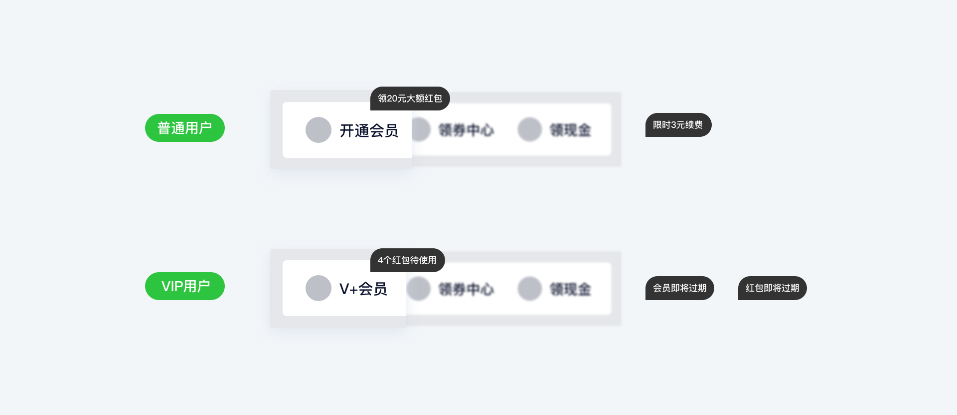 而对于新用户,最重要的是以免费新人礼包吸引并留住用户,对于付费的开通会员功能,则可能让用户望而却步,所以不需要重点提示,只需更改快捷入口文字即可。