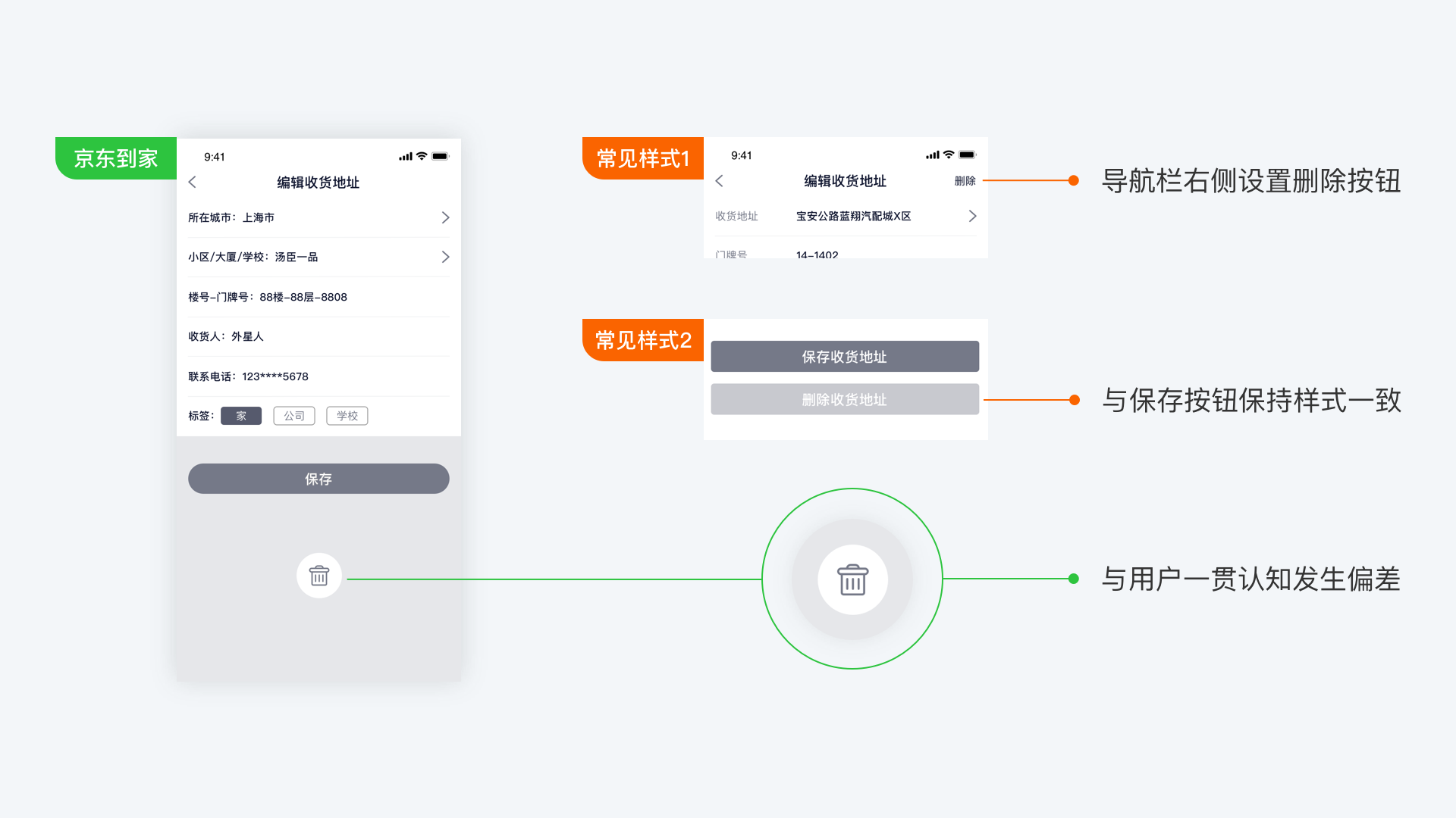 由以上可看出,其在页面底部的大面积空白区域“孤伶伶”的设计了一个删除按钮,从视觉层级的突出上来看,的确很快的抓住了用户的视觉重心。从手势热区来看,也可以迅速让用户完成操作。