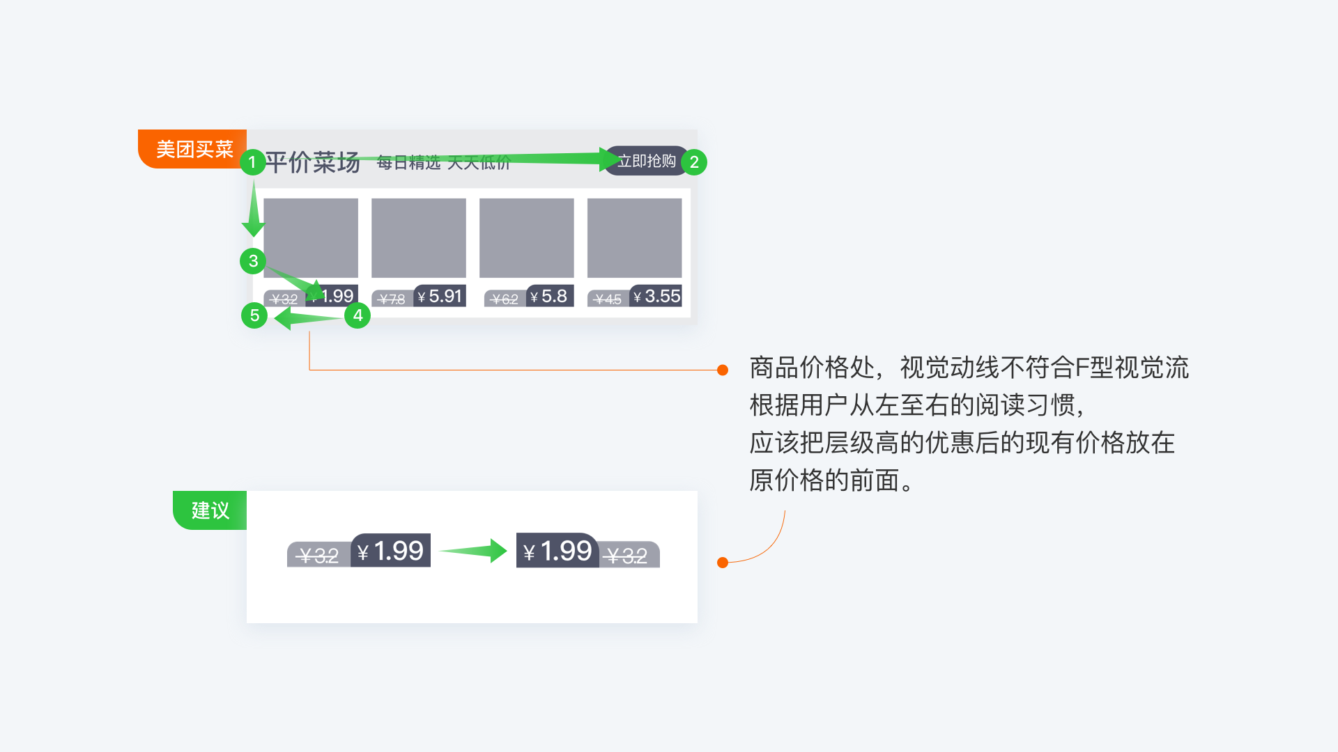 信息视觉流也就是尼尔森的F型浏览模式,即用户从左至右,从上至下的阅读浏览习惯。合理的视觉流就是依据F型浏览模式,将信息依次排布。