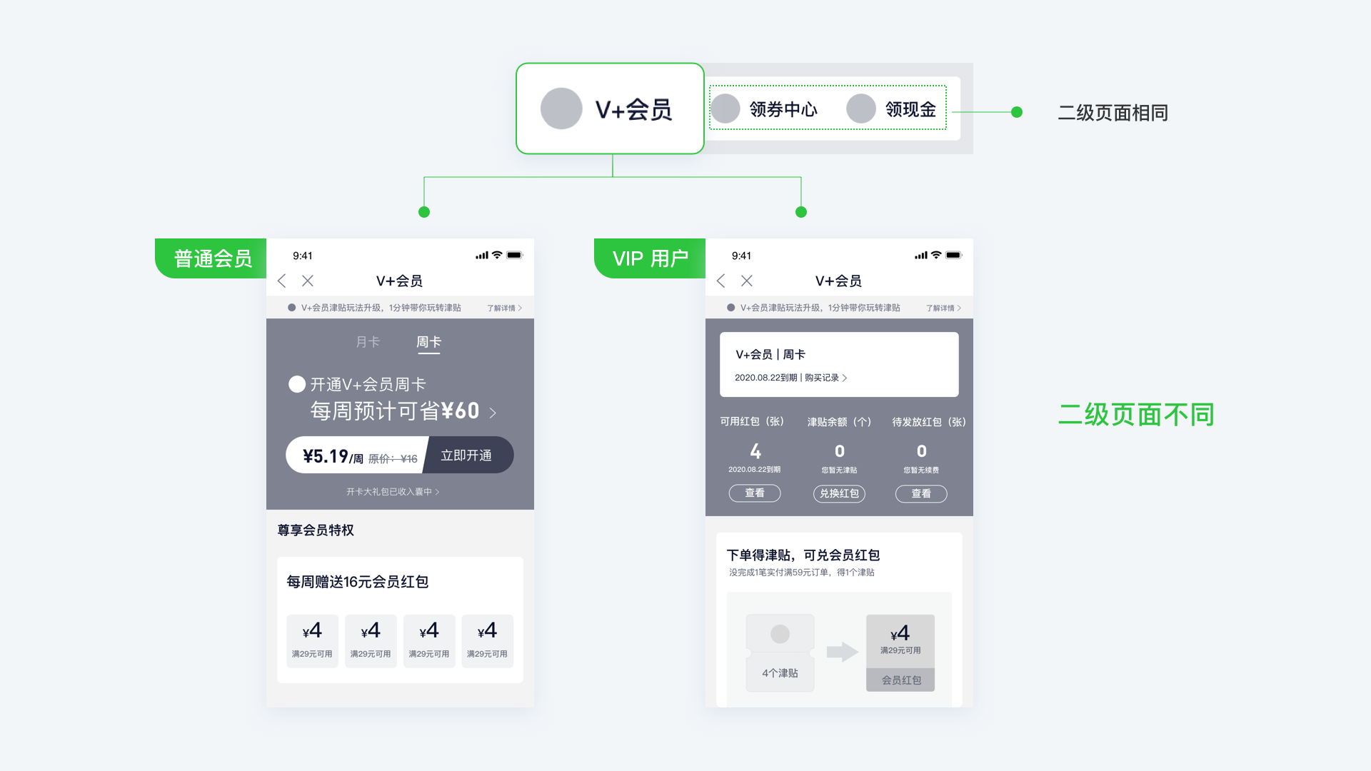 对于促进营收的增值模块【会员快捷入口】,VIP用户和普通用户在首页呈现相同,在二级页面却不同,在一定程度上不符合用户预期,且未能达到促进营收,提高转化的目的。