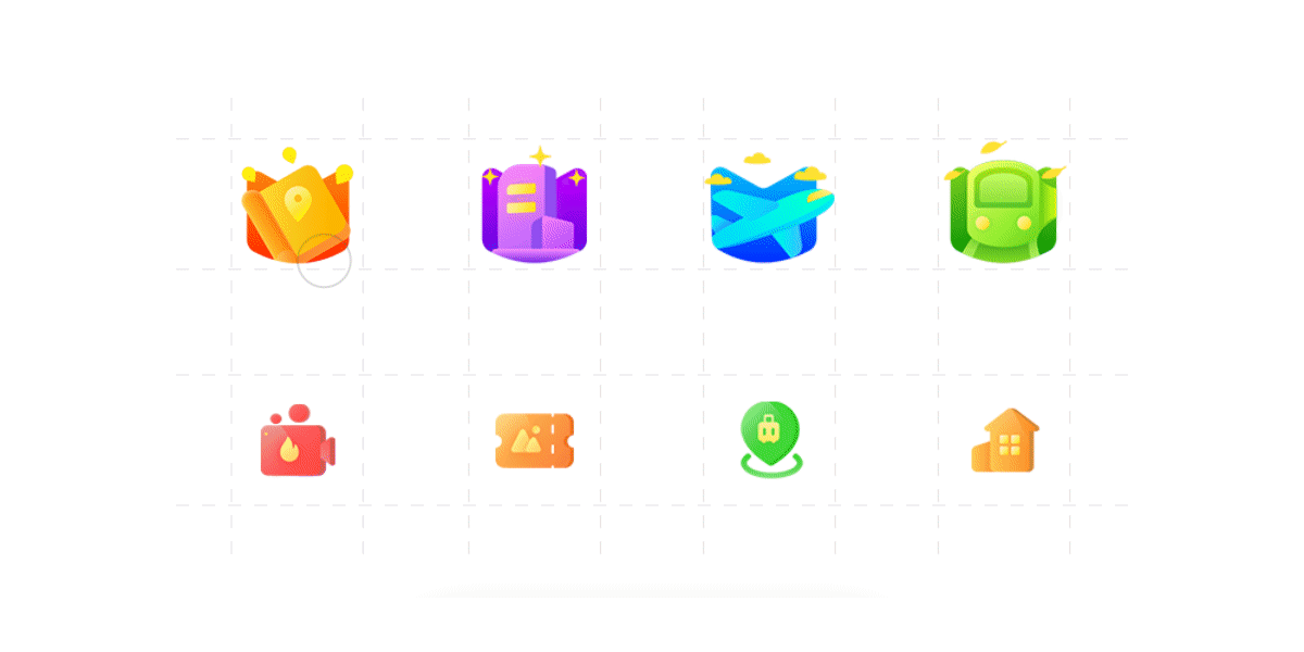 • 主流旅游图标特点:渐变、扁平拟物、破局、细节点缀、弥散投影、场景点缀。