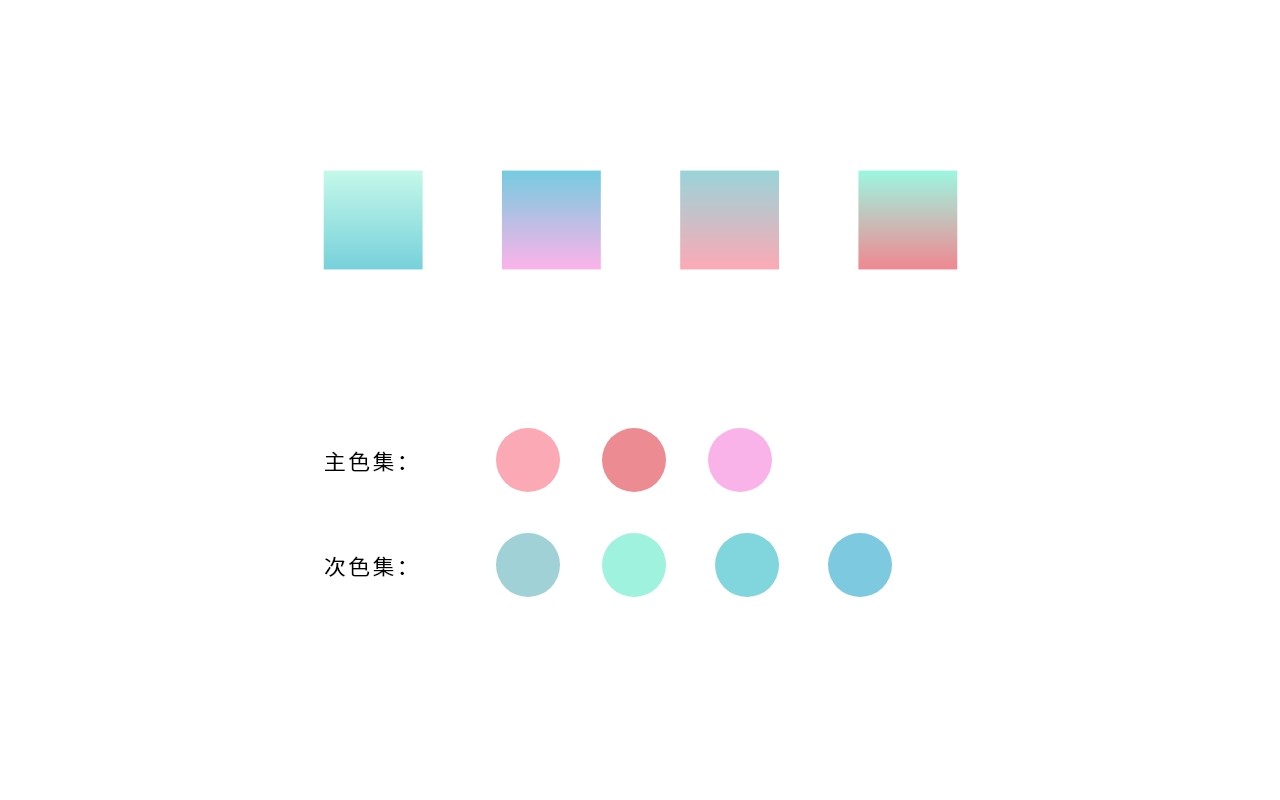 让我们运用渐变色,先做一个渐变的色板,这个色板将会运用到我们的图形当中。虽然是渐变,也需要考虑到主色、次色等色彩秩序关系。比如在这里,我们的主色是粉色,次色是薄荷感的蓝绿色,色彩的渐变也主要在这个范围内发生。这将是整个色彩的主要基调。