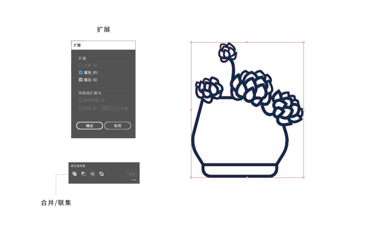 上色前,让我们对整个线条做最后的优化,然后再进入【对象>扩展】,将线条转为可填充的形状,然后把它们全部进行合并。