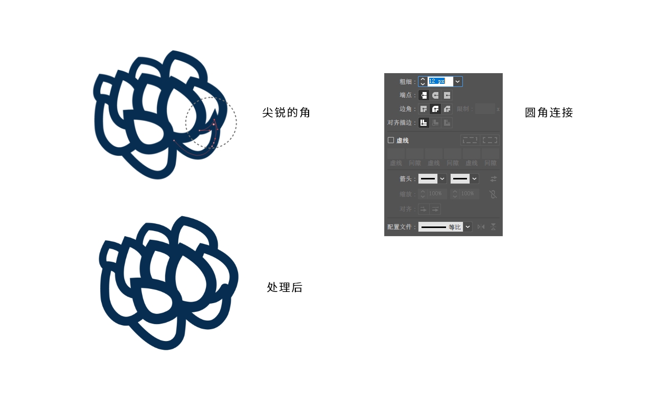 再绘制左边的叶片时,个别线条在转折部分如果角度过于小,就会形成一个非常尖锐的角状,这时,如果不是必须的情况下,就要将线条的边角改为“圆角连接”。