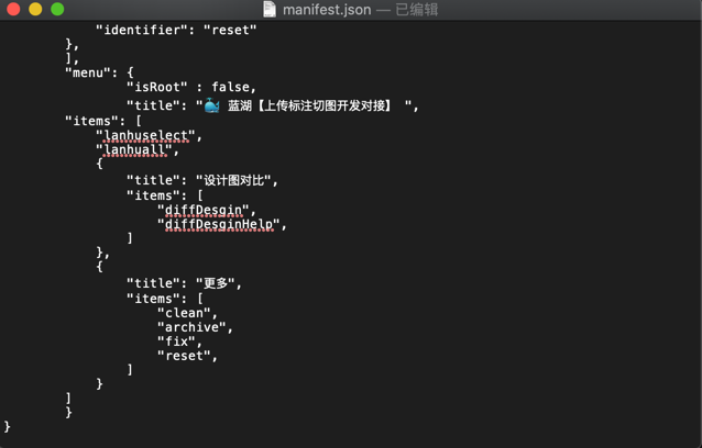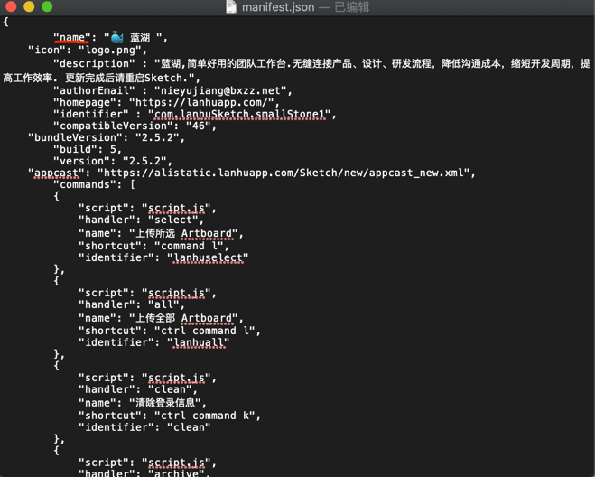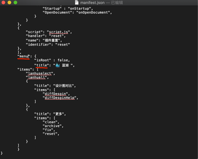 第六步:打开之后,你会看到下面这样的界面,找到“name”和“menul下面的title”,“name”后面名字就是目前插件管理的插件名了,“menul下面的title”后面的名字就是插件栏里面的插件名了