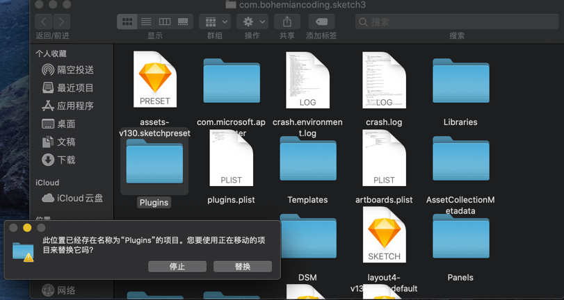 第三步,一种是直接用下载我的“Plugins文件”替换里面的“Plugins文件”,怕出错可以先备份一份你自己的“Plugins文件”,第二种是把下载我的“Plugins文件”打开,把里面所有的插件复制进去,遇到重复的插件,选择替换即可,替换完成后,重新打开sketch,你的插件栏也会变得和我一样啦!