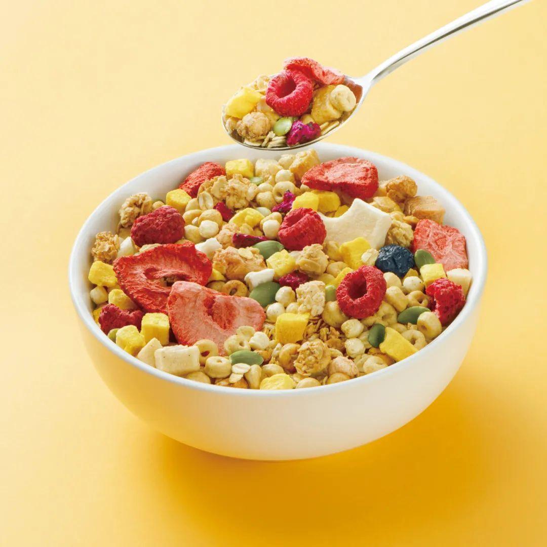 根据「美国癌症协会」推荐的《彩虹饮食法》及「中国营养学会」的《中国居民膳食指南》,吃个彩虹采用“谷物燕麦+多种冻干水果”理念,提供多种不同颜色种类的蔬果,兼顾美味与健康,让营养更均衡。