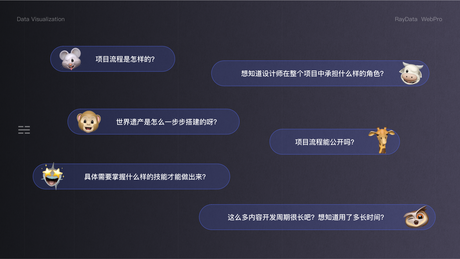 本篇只以世界遗产为例,列举了小部分功能使用说明,还有其他更多彩蛋功能可以去亲自体验和探索,后续,我们也会在RayData实验室公众号上发布更多使用教程和案例,以帮助有需要的小伙伴深入了解RayData专业版功能以及可视化项目的设计思路