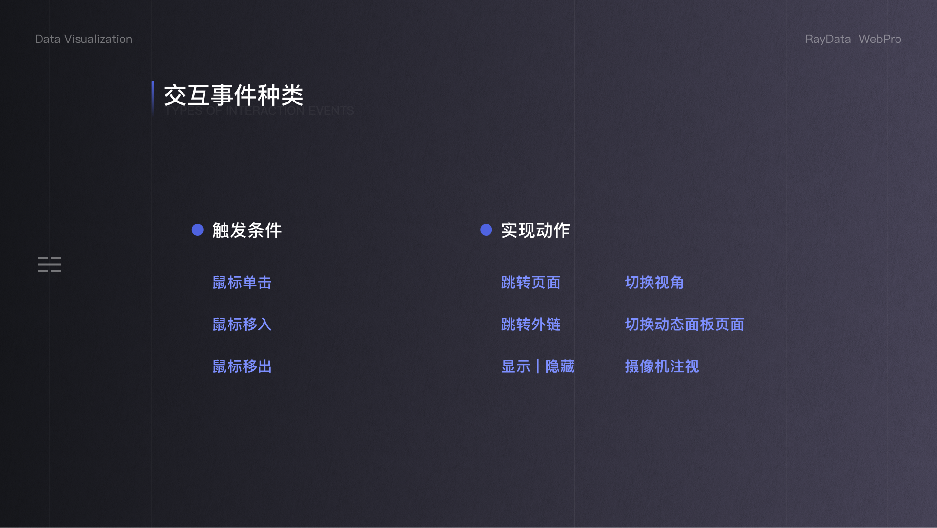 搭建好界面后,可对二维/Box热区部分添加多种联动交互事件,包括跳转、跳转外链、显示隐藏、切换视角等等,通过不同的界面需求去选择合适的交互联动