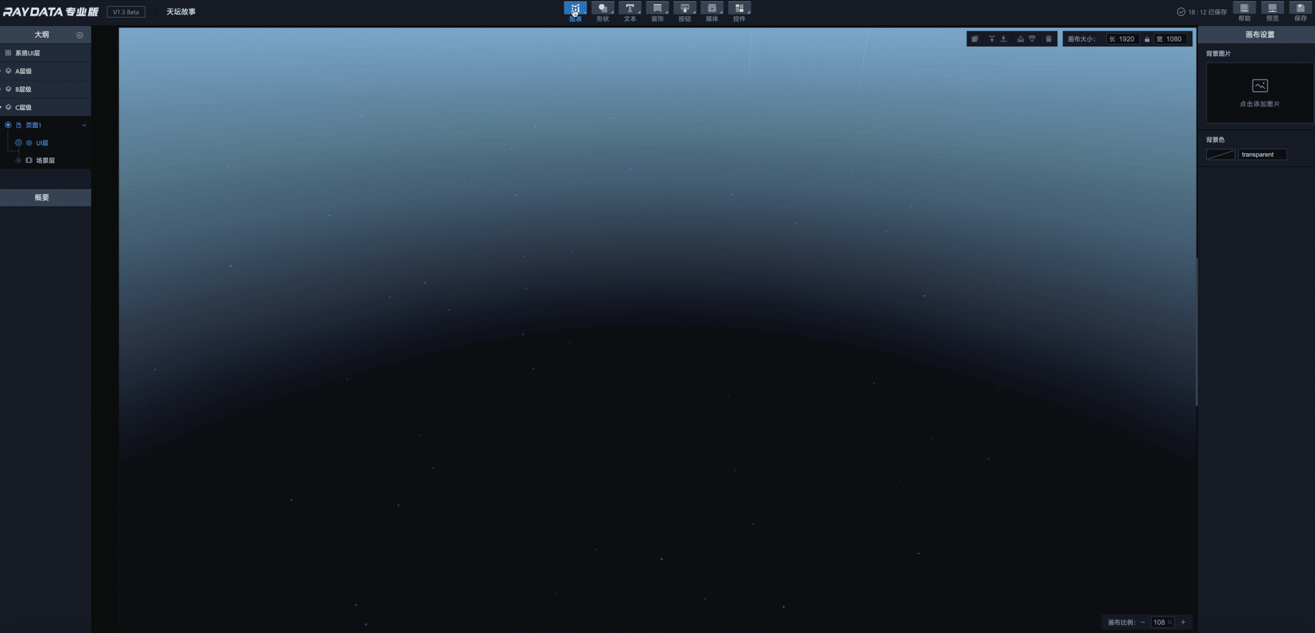 场景搭建完成后就可以进行UI搭建了,前期我们会输出原型和设计稿,方便之后的搭建,UI界面的搭建同样在RayData专业版中进行,搭建的时候注意要选择UI层在进行操作