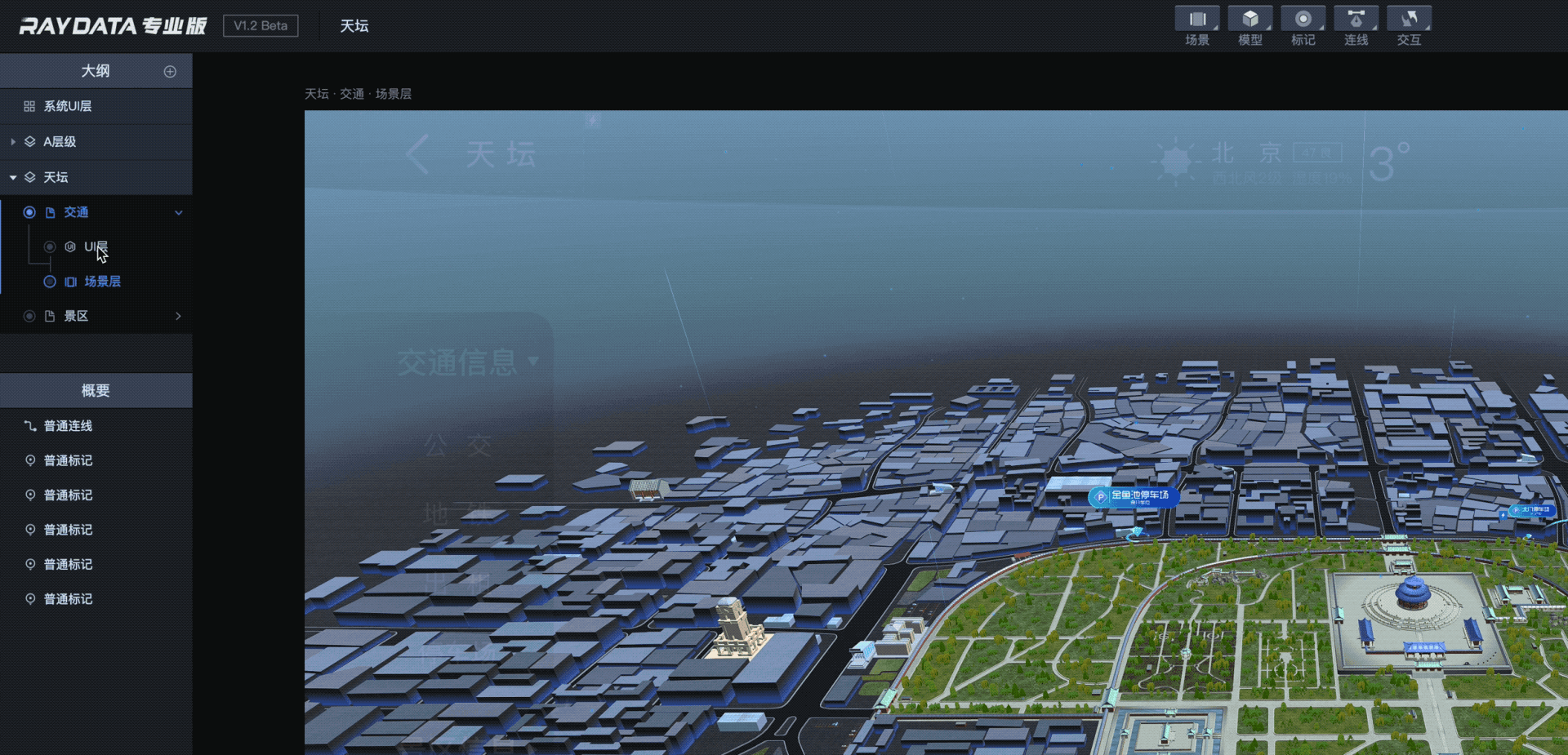 上传好模型,在模型库-我的资源里选择使用,就可以开始项目搭建了,需要注意的是,RayData专业版为了提供更便捷的搭建体验,将整个界面分为场景层和UI层,像场景模型、信息标记这类功能都需在场景层进行搭建