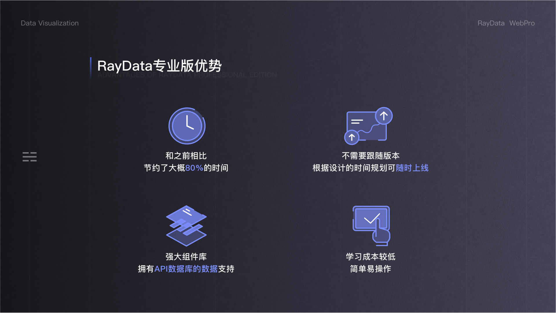 随着新基建时代的到来,可视化在不同领域的价值渐渐被人挖掘,越来越多的行业和职业都把可视化当作一个表达基础,但想要制作一个完整的可视化项目,对于一些非技术出身的小白或企业,往往需要花费大量的时间在相关内容的学习上,付出很多技术、金钱和时间成本,而RayData专业版无疑能打破这一状态,让更多的人快速步入可视化领域,亲自感受到可视化的强大