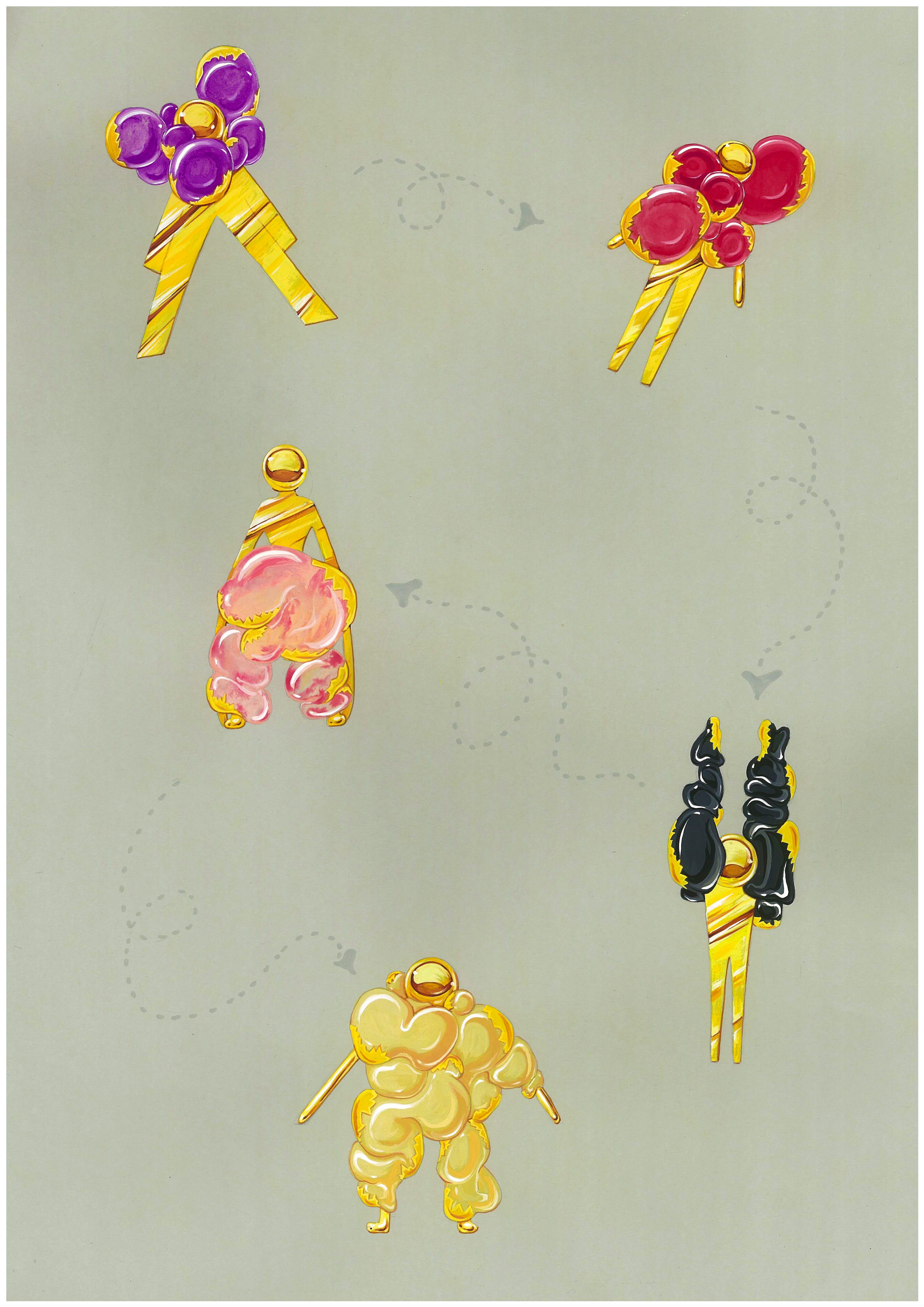 设计说明:过度的肥胖会引起皮肤出现开裂的情况,形成肥胖纹,会严重影响人体美观。这套首饰就是从这一方面的内容进行变形设计的。这五个胖胖的小人分别代表的是,双下巴,大肚腩,萝卜腿,麒麟臂和全身性肥胖。镶嵌部分的灵感来源是肥胖纹,用闪电形表现分裂的感觉。