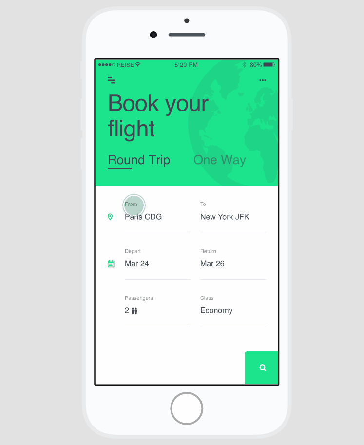 今天的案例将展示查询及购买机票的流程,可以通过摹客(https://www.mockplus.cn/ )所提供的最常用的8种交互方式以及15种交互动画,实现搜索框的下推入以及购买以后电子机票弹出效果等基本的页面跳转。 演示如下: