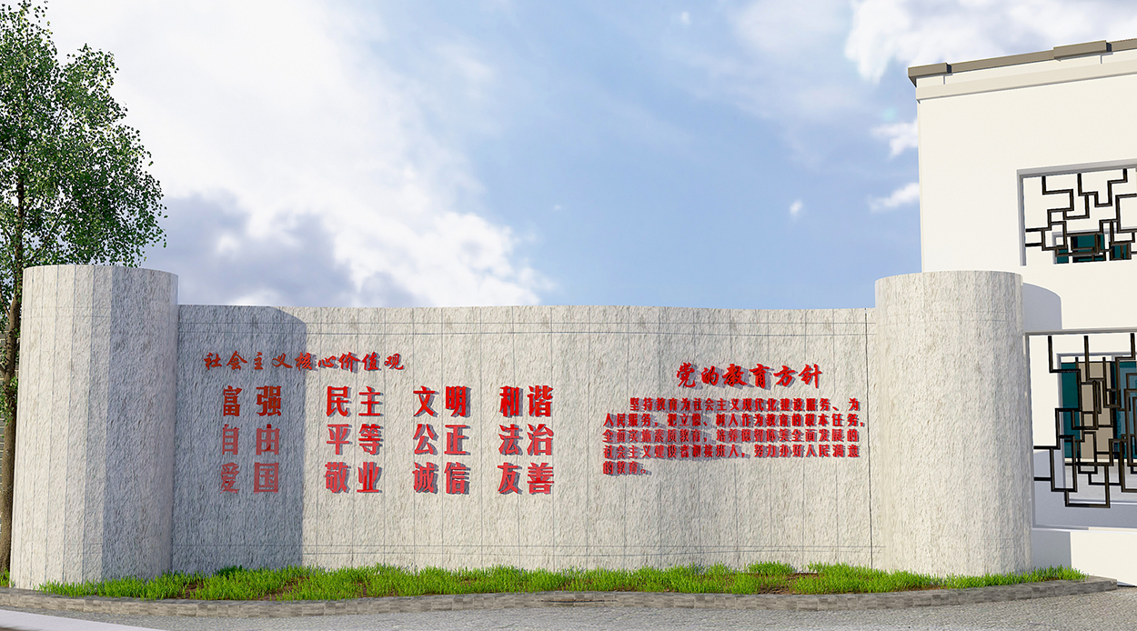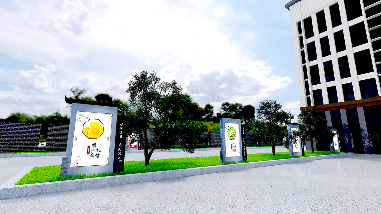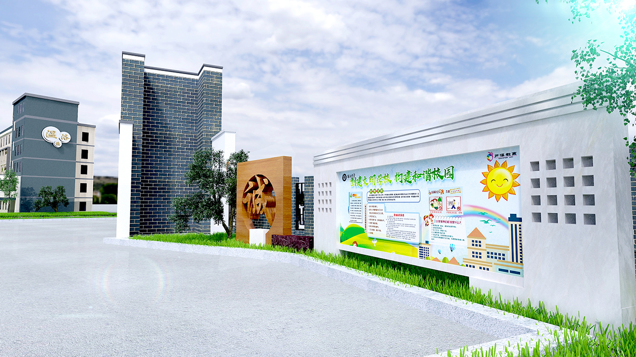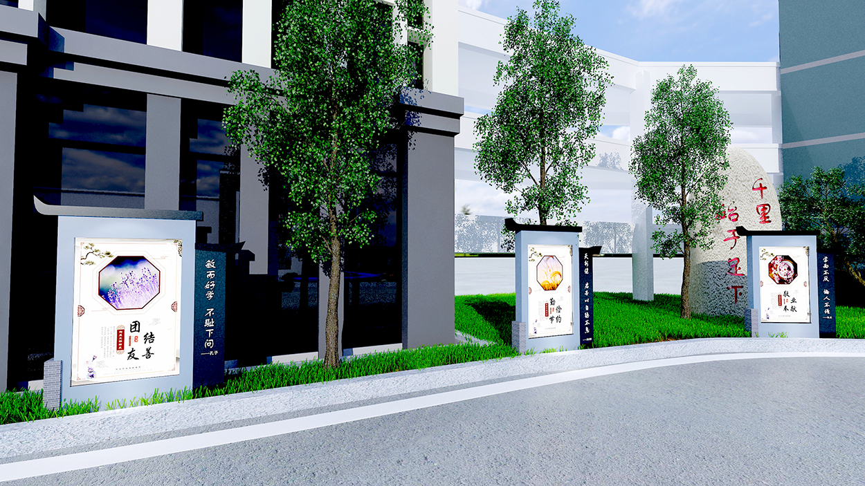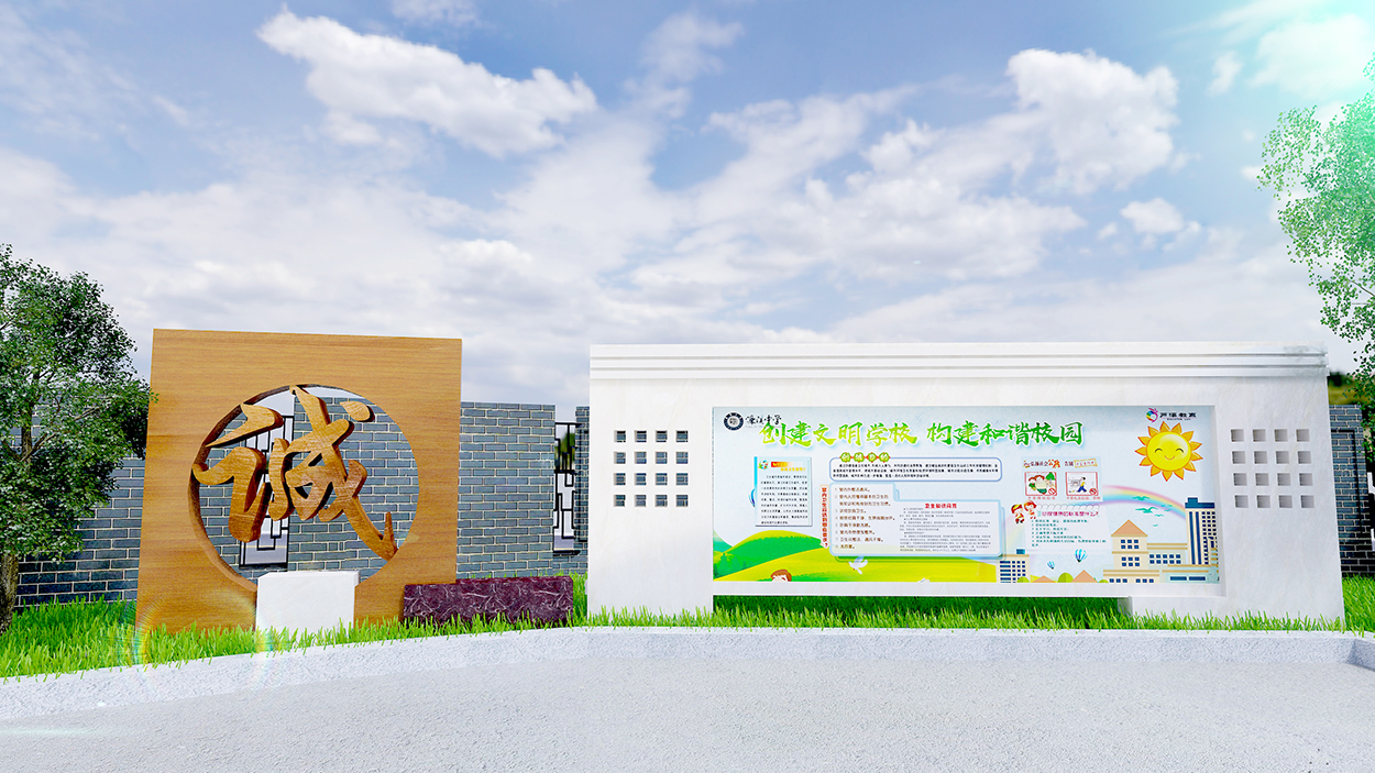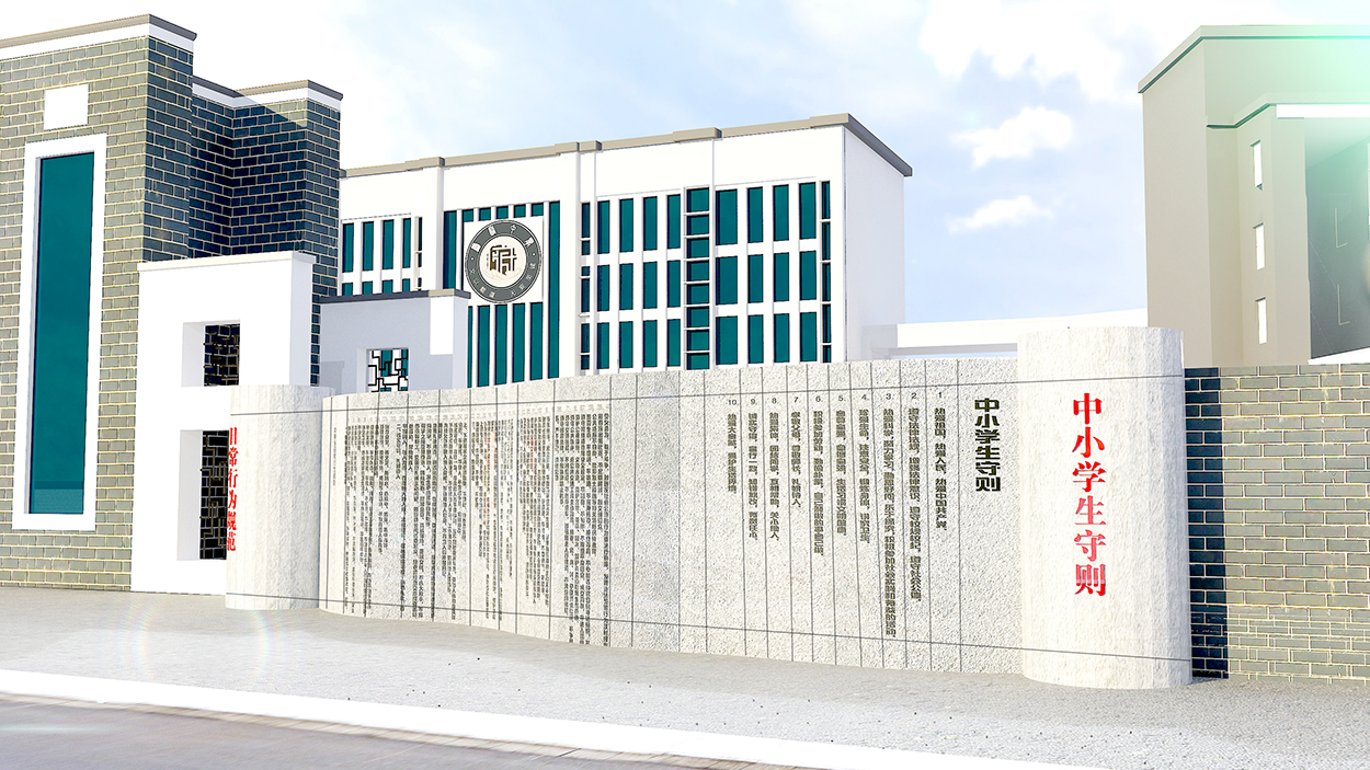 校门左右两侧分别覆盖内容是,中小学生守则和中小学生行为规范(右)、社会主义核心价值观和党的教育方针(左)