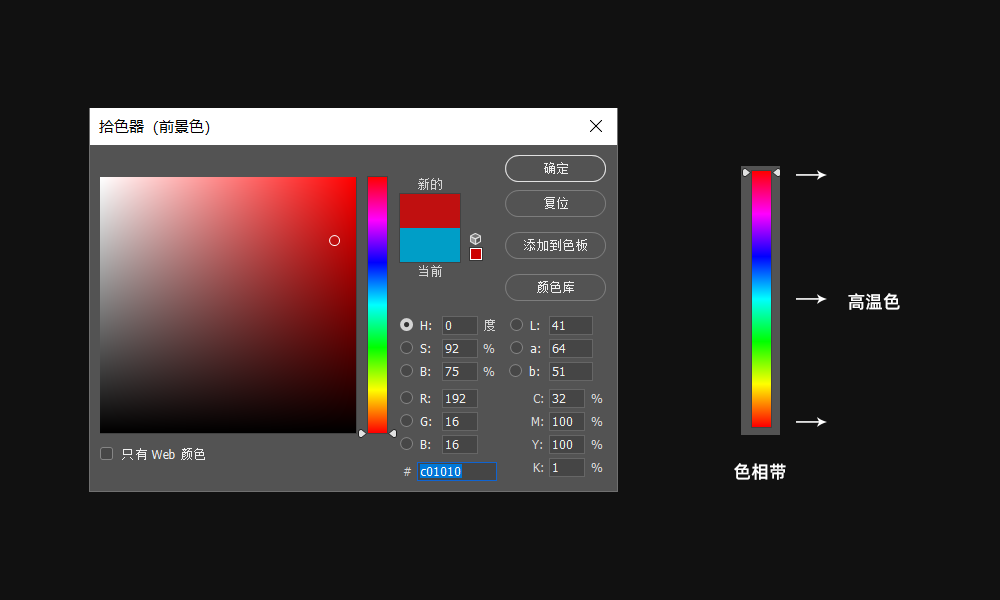 大家可以看到下图的左边是我们在ps里最常见的色框,右边是对应的色相带,仔细看右边的这条色相带,我们会发现色相带上有三处十分刺眼的高亮颜色,这三个刺眼的高亮色叫做高温色。