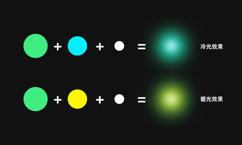 同理我们可以得到其他颜色的光。蓝色光,高温色就往青色走,紫色光,高温色就往玫红色走。如下图,绿色我们都知道它是中间色,可冷可暖。所以做暖光的时候高温色就往黄色走,做冷光的时候就往青色走即可。