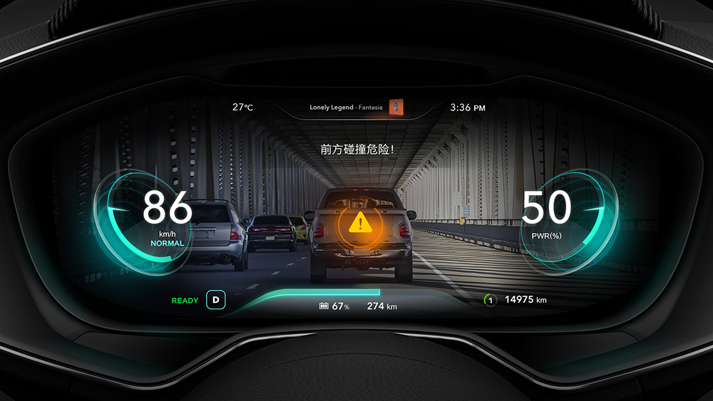 例如下图,通过光效加强了视觉的层级感,均匀的呈放射性进行过度,让左右两侧的公里数和耗能的圆环看起来更加立体饱满,近几年车载设计中很多优秀作品里都会使用光感效果。
