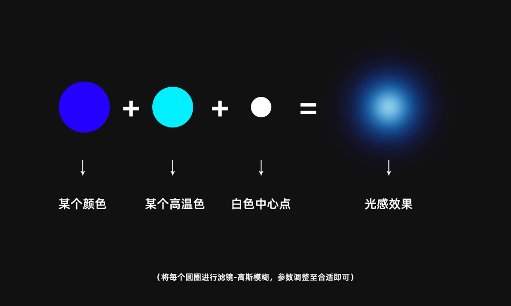 大家一起回忆下我们初中的物理课,在讲到火的时候,老师会告诉我们火分内焰+外焰,温度最高的是蓝色的。那么光也是一样的,光不是单单一层,光有三层。如下图,我们随便选取一个色板上的颜色,然后加上高温色与白色,进行高斯模糊可以得到一个光感效果的圆圈。