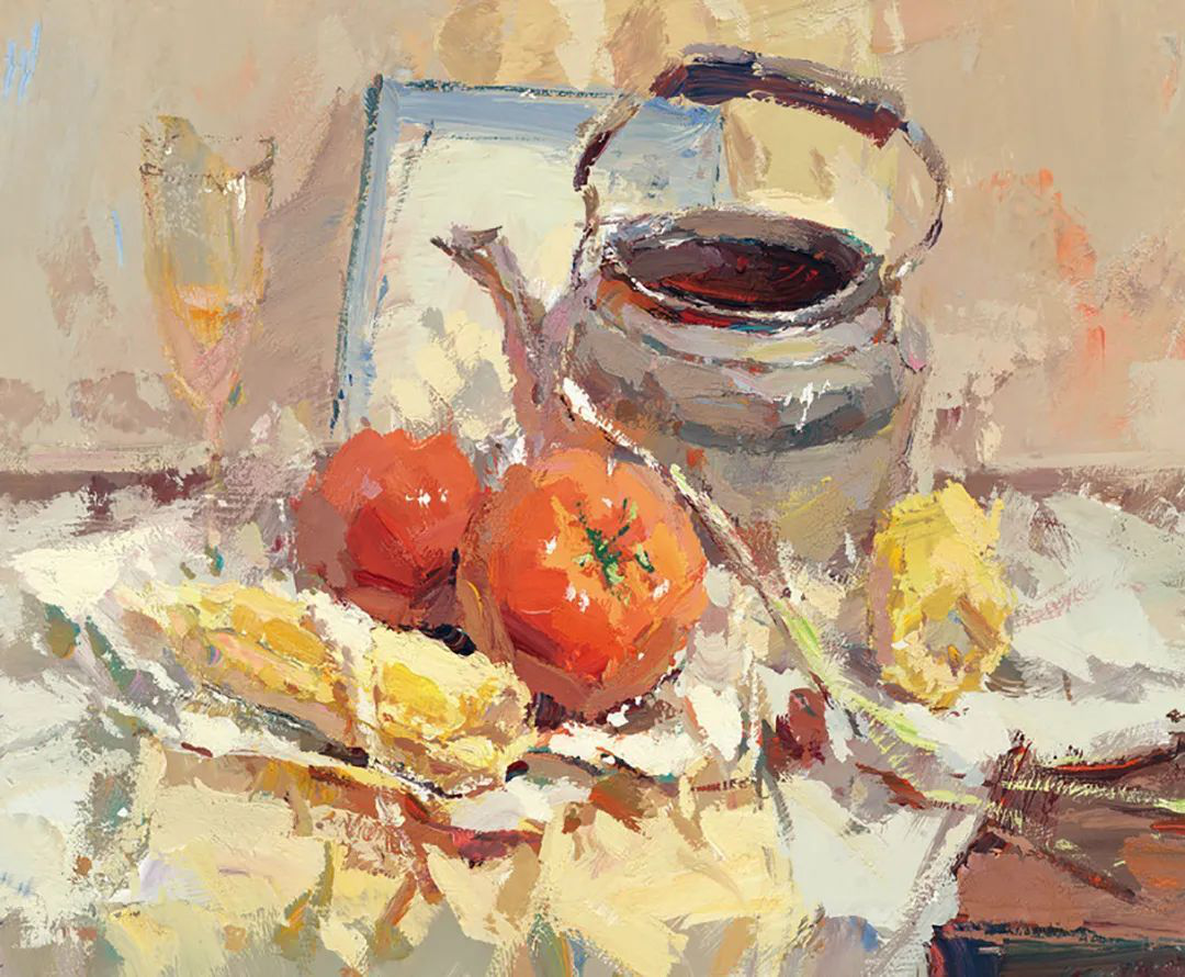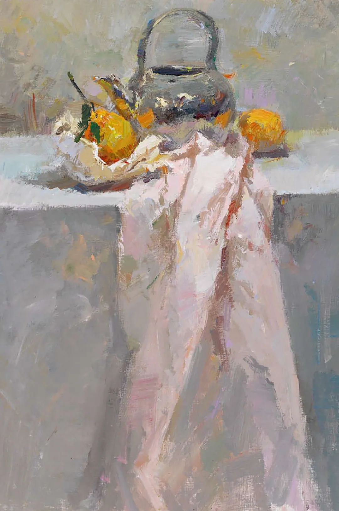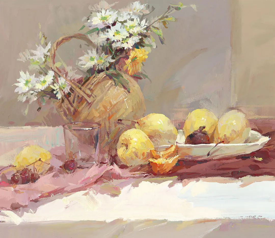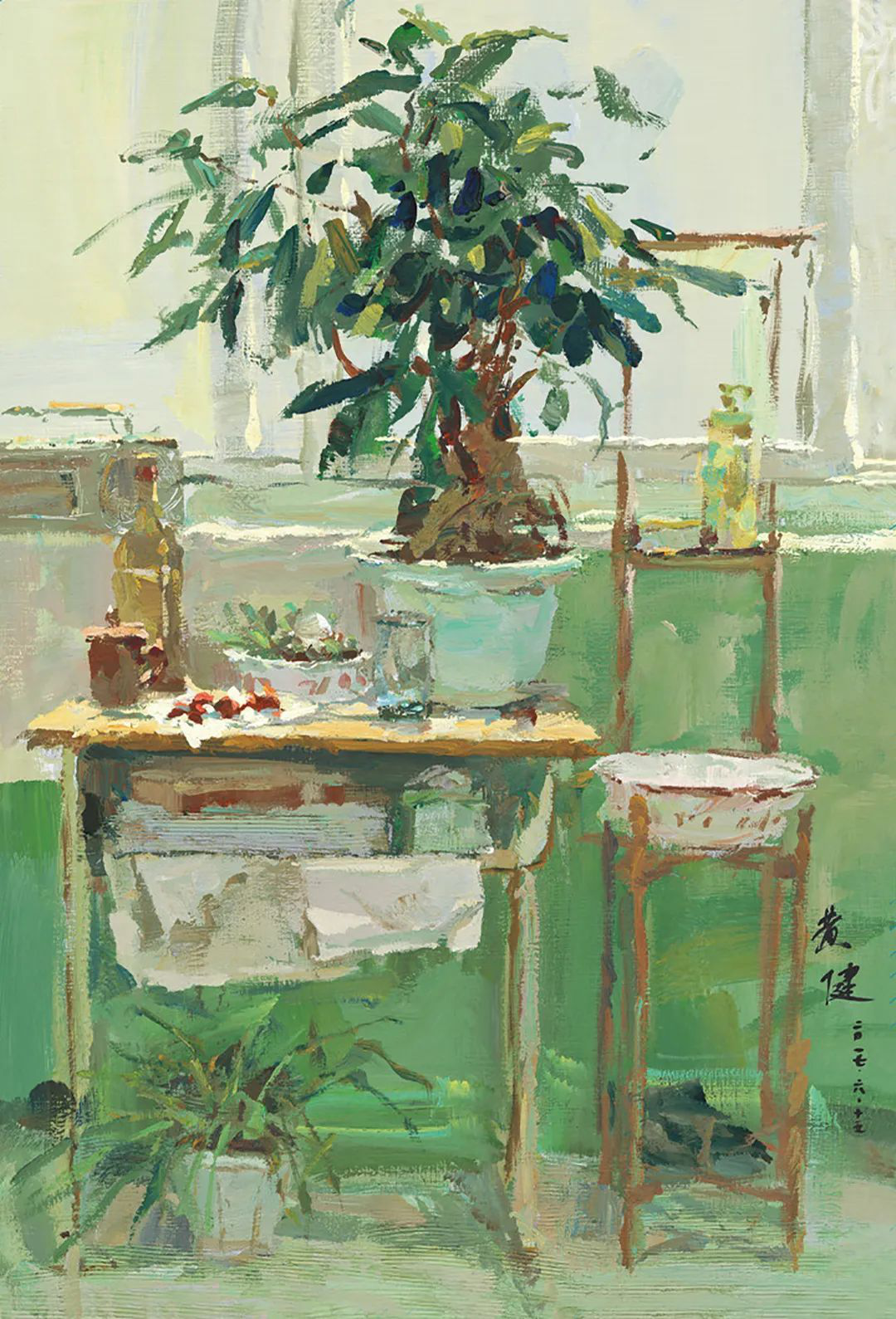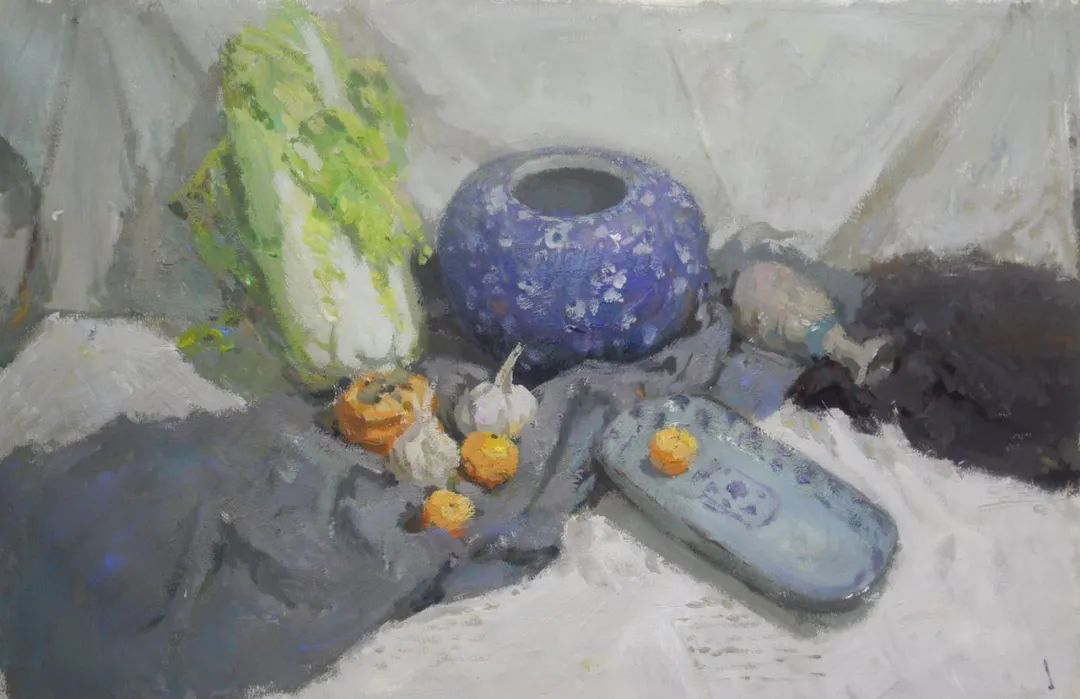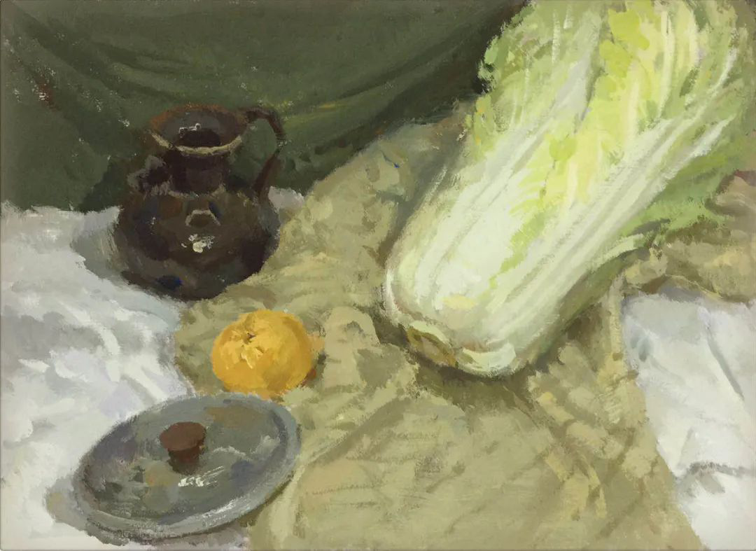 用扁笔调准颜色,准确稳当地摆上去用笔肯定,笔触明显,运笔慢,色较厚。