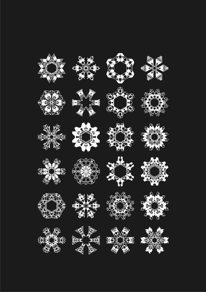 原理就不多说了,切割、复制、镜像而已——没有使用高大上的分形技术。貌似一提雪花,每个人都能在第一时间想到“分形”二字。偏不用它。