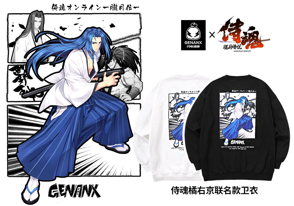 2020年,在GENANX闪电潮牌即将迎来10周年之际,品牌猛发力,再触电格斗游戏界。此次,品牌与SNK旗下公司声名大噪的刀剑格斗招牌手游《侍魂:胧月传说》合作,推出联名款。此举跨圈联合,以唤醒80s、90s的年少情怀,为当年游戏玩家提供有意义的IP潮服,也吸引新一代年轻玩家了解这硬核格斗、经典IP,燃热血,燥青春。