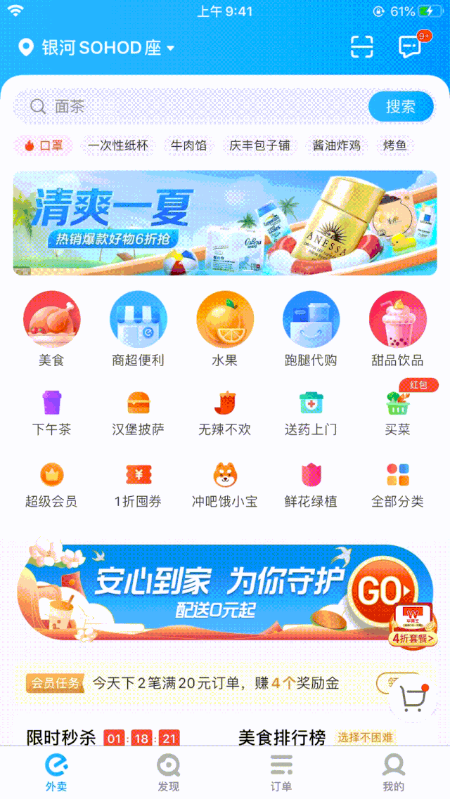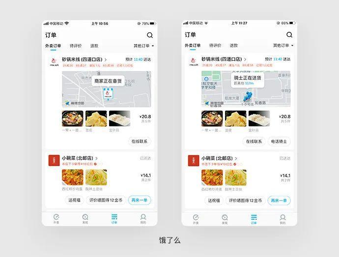 在饿了么下单后,在订单页第一个位置就会显示当前订单的状态,通过地理位置来告知用户“正在准备中”“正在送货”以及配送员距离你多少米的显示,下雨天,地图上则会以下雨的样式展现,体验非常细腻,使用时就像是跟一个知心的朋友聊天一样,对每一步都及时并清晰的进行反馈告知,不需要用户消耗多余的时间去猜测。
