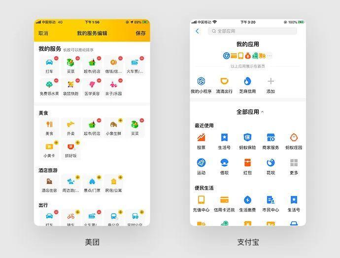如美团、支付宝金刚区个性化编辑功能,用户可以根据自身需求与喜好来编辑功能的显示与顺序,常用功能靠前,不常用功能删除,提高了用户的使用效率,如下图: