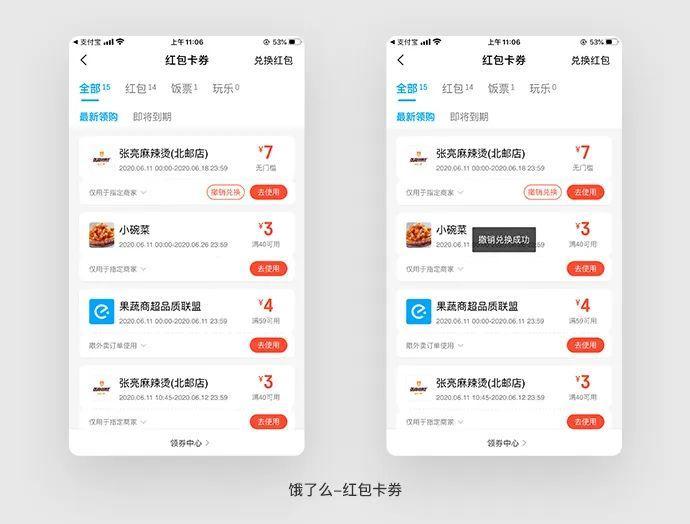使用饿了么app,如果用户近期不想吃这家外卖,但是又不小心兑换了红包,则可以在红包卡劵的页面撤销兑换,避免了用户因为自己的操作错误而带来损失。