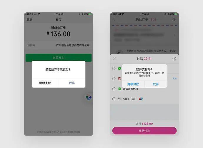案例:如唯品会正在支付中,退出支付页面时,会弹出弹窗提示“放弃支付吗”,提醒订单会在30分钟后取消,在用户可能会出现错误或重要操作退出时给用户一个善意的弹窗提醒,防止用户因不当操作造成损失。如下图:
