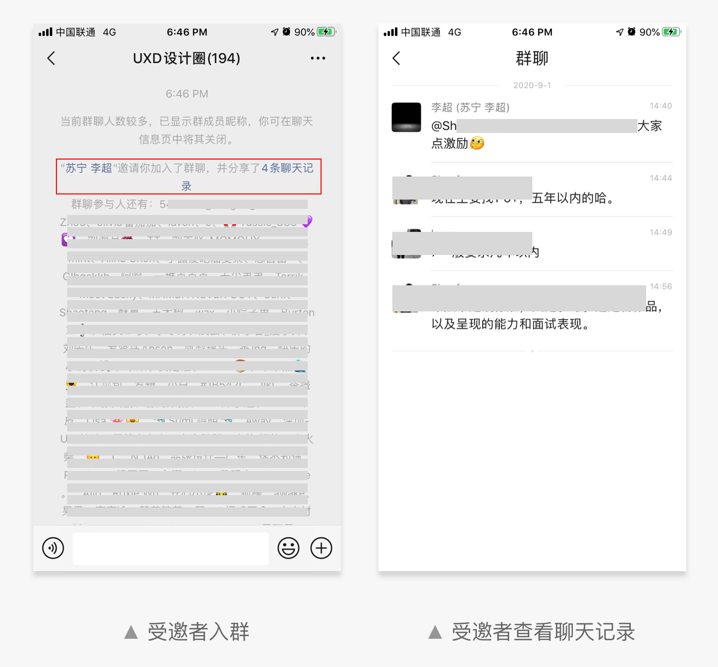 这就解决了特定场景下,群信息共享的痛点。例如当我们讨论工作时,需要中途邀请其他同事加入讨论,此时有必要让他们了解部分内容,便于快速入群加入讨论,提高用户效率。