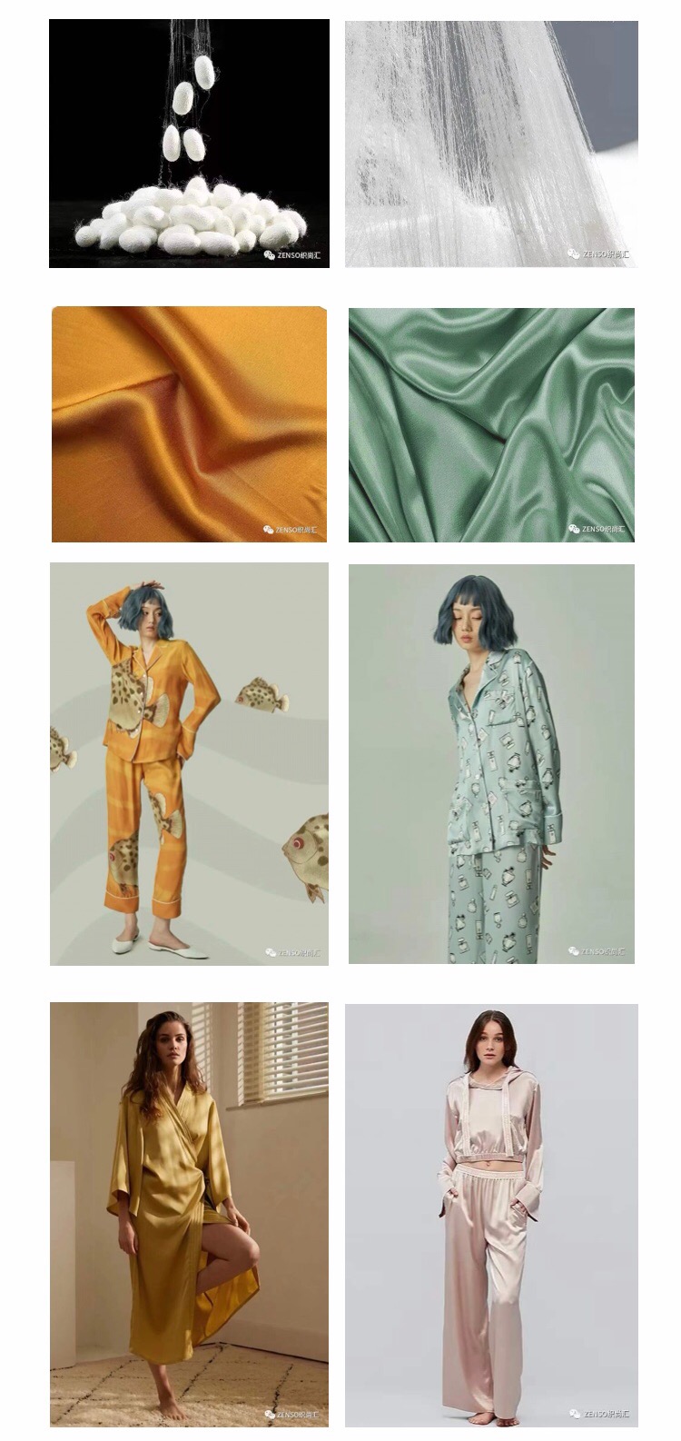高级蚕丝绸面料因手感细腻柔软,抗皱性好,垂坠度佳,不易拔丝,本身还有如珍珠般莹润透亮的光泽感,给它带来高贵优雅的气场,是制作高级家居服面料首选之一。纯色的蚕丝绸家居服自带高级感气息,而带有印花设计的丝绸给人的是高级稳重中带有一点小俏皮,给平平无奇的生活增加一点灵动感。