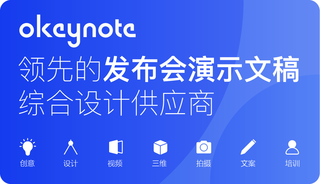 okeynote是领先的发布会综合设计供应商,我们专注于发布会视觉创意、演示文稿、主视觉、视频、三维、拍摄等综合设计服务。我们的客户包括vivo、华为、CCTV、猫眼娱乐、京东、海尔、雷克萨斯、威马、美的、布谷等国内外众多一线企业。我们以更专业的设计与创意为全球品牌注入更多创造力。