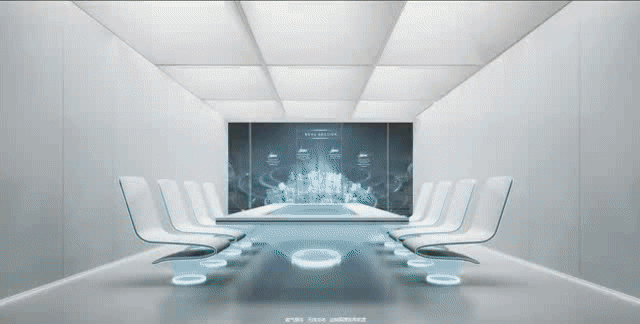 未来,会议室使用直线进行切割,天光从十字造型洒下,塑造温暖舒适的办公环境,家具桌椅等均采用磁气悬浮和无线充电,可以根据人的体重和身高调整适宜的高度和柔软度,而对面的玻璃在视频会议时可以实现远程影像的交流,整体空间设计与灯光的结合充分展示着未来会议室的科技、智慧与人文精神。到了晚上,通过些许的改变就能打破会议室的严肃氛围,变转为休闲场景。随着智能灯光的变化,给需要的人提供独自的冥想或多人聚会的空间,以空间复用及组合的角度赋予场景无限的可能性。