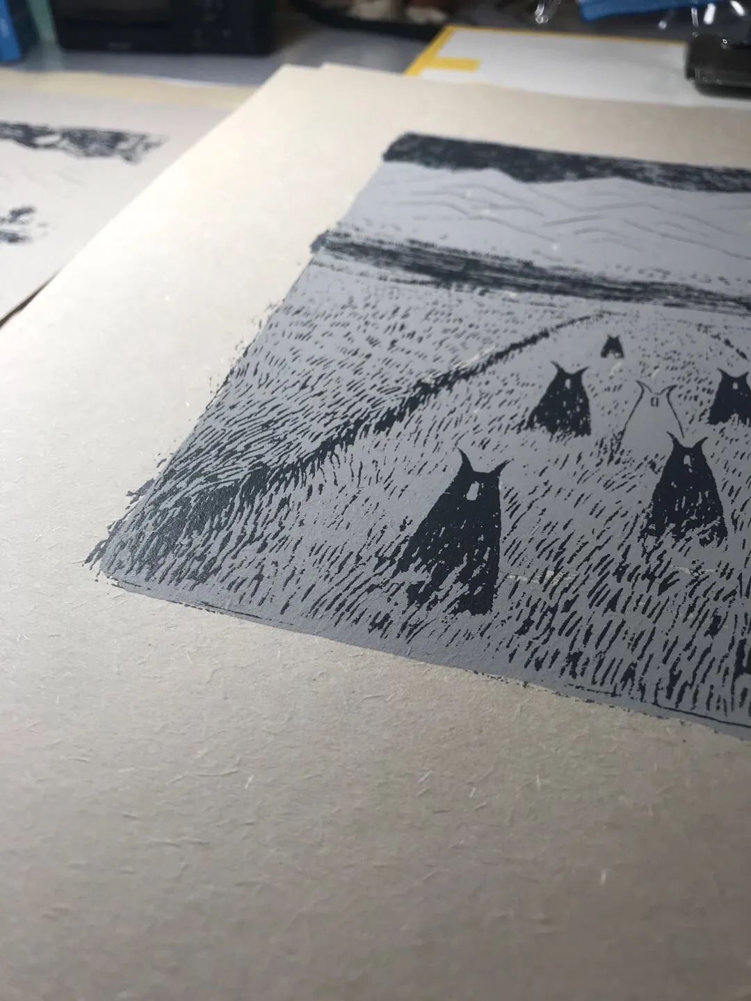 在经过了若干次的尝试和准备后,终于迎来了正式的印刷。一开始不知道天高地厚,想要尝试两个颜色套色。谁知印了第一个色之后,发现第二个色很难套准,出来效果也不是太好……只好作罢。但已经印了第一色的纸张又不想浪费了(纸张是专门买的带有植物纤维的大地纸),于是想到了一个补救的办法,就是用一个浅灰色的大色块盖上去,然后再在上面印深灰色的图稿。结果就是一幅看上去只有两个色的版画,实际印了三次……