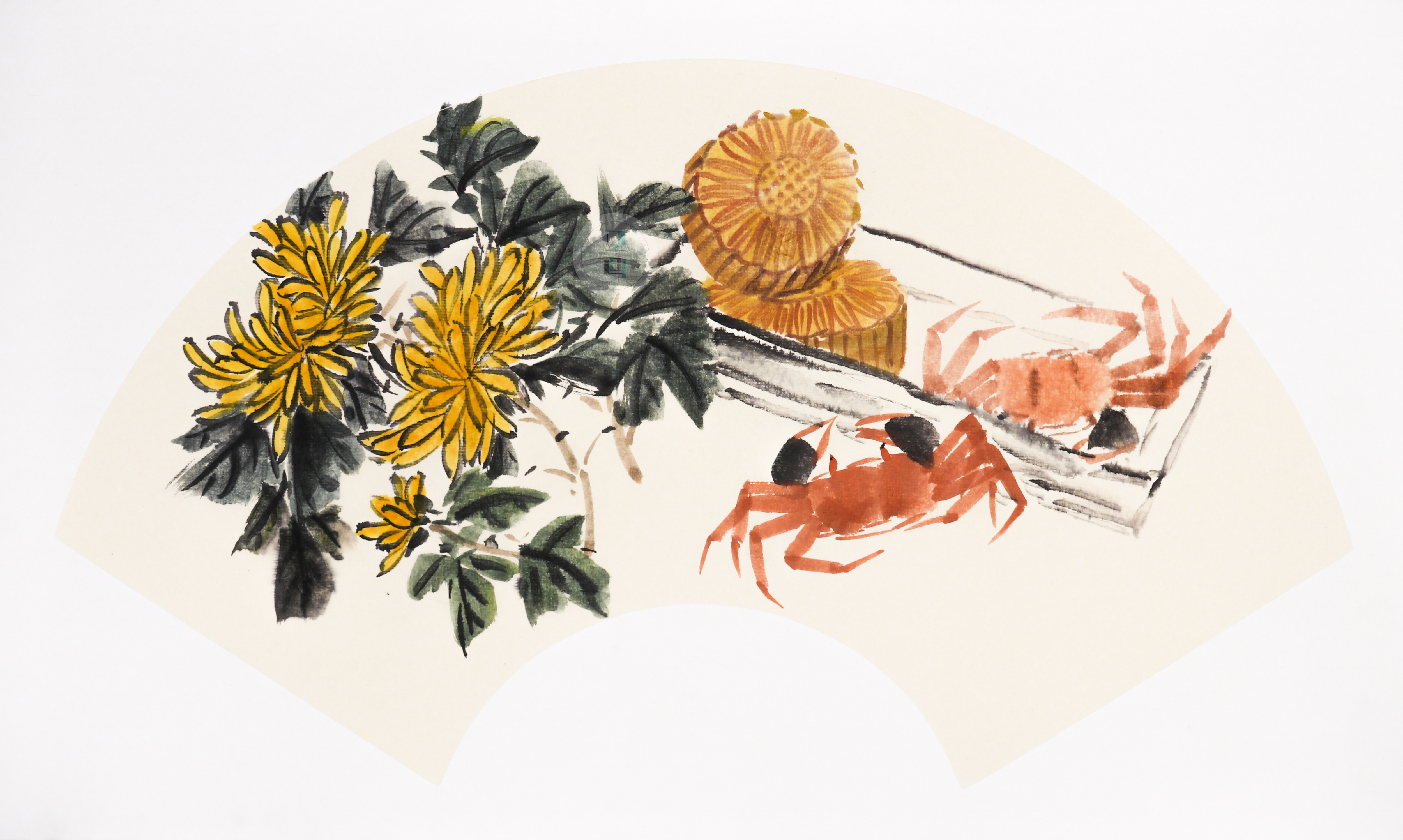 月饼的颜色先用藤黄加少量朱膘调色打底画平面,在之前的颜色基础上再加少量的墨画立面,菊花叶子用花青、藤黄调出绿色,然后加墨色降低纯度,半干之后勾勒筋脉。