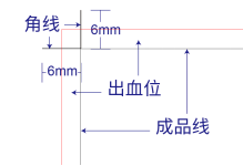 在做好成品尺寸(包装是展开的刀版图)后,马上制作角线、出血线,角线是两条6mm的线,垂直与水平各一条设置好出血、角线后,就要设置版心了,版心的大小没有规定,但是四边一定要离裁切位3mm以上。包装的话,我一般都会设置为5mm。