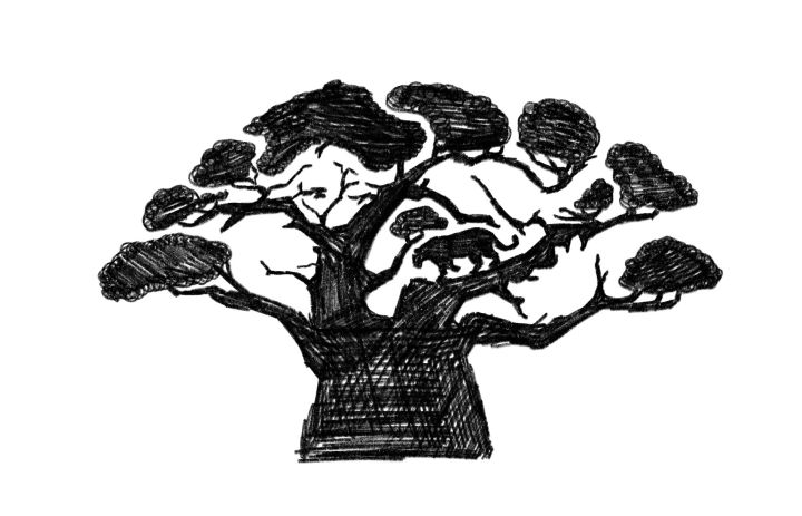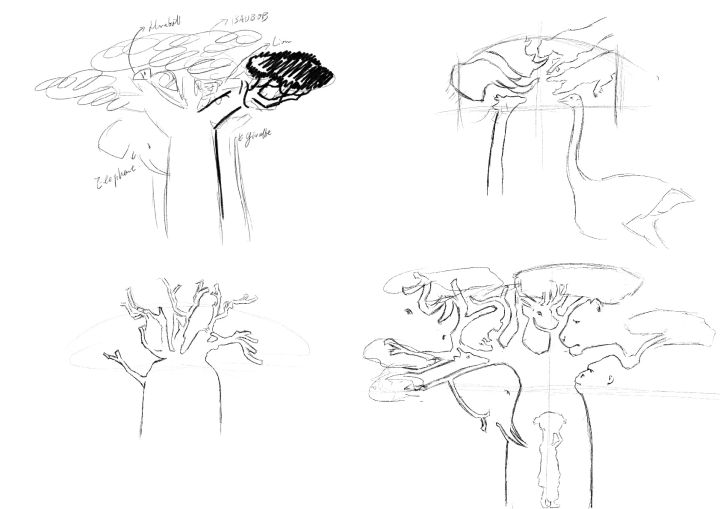 新的草图本期望通过轮廓与模糊处理的手法来对动物进行演绎,最大限度的保持猴面包树的自然视觉并建立顾客自主发现的惊喜感,但是委托人认为如此一来动物的构型就显得不够准确(是的,在这份案例中我们充分学习了非洲象与亚洲象的面部区别,黑犀牛吻部特征与非洲水牛犄角走势等知识)。