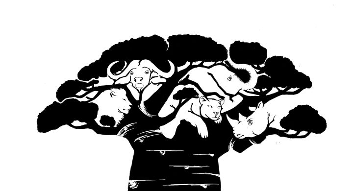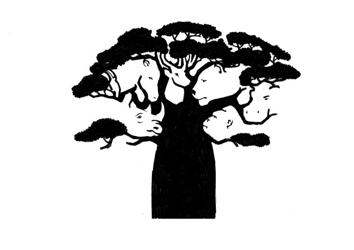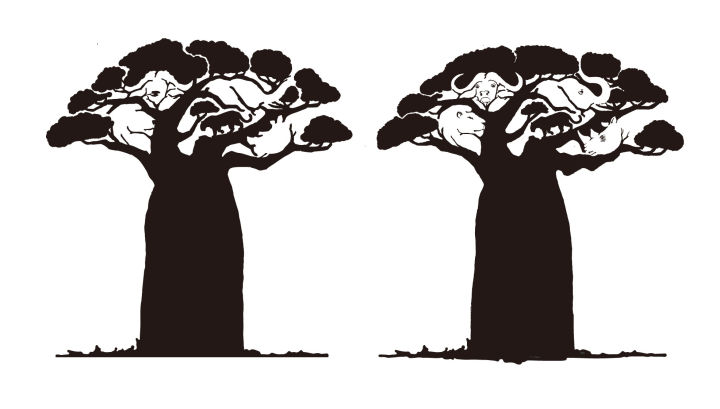 负空间设计并不需要由图将底完全包裹,但是通常来说需要围合至少三个面以保证识别性。这也是这份稿件的问题所在,犀牛和猩猩下方的树枝结构与正常猴面包树的结构相悖需要修改。同时动物中的鹿与马亦缺少非洲地域特征。委托人建议将动物替换为非洲五大兽(即非洲狮、非洲象、非洲水牛、花豹和黑犀牛)。
