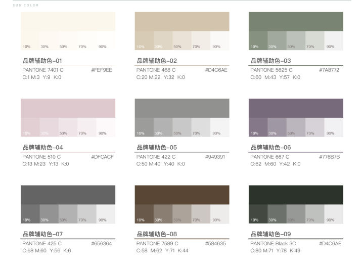 辅助图形是VI设计的重点,本稿采用了阵列、分割与裁切三种不同用途的辅助图形通过排列组合来营造设计框架下丰富的视觉效果。